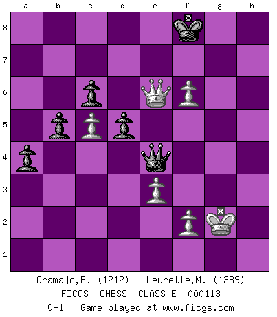 Last move : 0-1 2009 October 23 23:56:3 [Event "FICGS__CHESS__CLASS_E__000113"] [Site "FICGS"] [Date "2009.09.29"] [Round "1"] [White "Gramajo,Francisco"] [Black "Leurette,Marc-Antoine"] [Result "0-1"] [WhiteElo "1212"] [BlackElo "1389"] 1.Nf3 d5 2.g3 Nf6 3.d4 Nc6 4.Bg5 h6 5.Bxf6 gxf6 6.Qd3 e6 7.Nbd2 f5 8.c4 Bg7 9.c5 b6 10.Nb3 f6 11.Nh4 a5 12.Qe3 a4 13.Nd2 Nb4 14.Qc3 Nc6 15.b4 b5 16.a3 e5 17.Ndf3 exd4 18.Nxd4 Nxd4 19.Qxd4 c6 20.Ng6 Rg8 21.Qe3+ Kf7 22.Nf4 Qe7 23.Qf3 Bd7 24.Bg2 Rh8 25.Qh5+ Kg8 26.O-O Qf7 27.Qf3 h5 28.h4 Bh6 29.Nxh5 Rf8 30.Bh3 Be6 31.Bxf5 Bxf5 32.Qxf5 Bg5 33.Nf4 Bxf4 34.Qg4+ Bg5 35.hxg5 f5 36.g6 Qf6 37.Qf3 Qxg6 38.Kg2 Kf7 39.Rh1 Rfg8 40.Rxh8 Rxh8 41.Qc3 Rg8 42.Rh1 f4 43.Qf3 Qe4 44.Rh7+ Rg7 45.Rxg7+ Kxg7 46.gxf4 Kf6 47.e3 Qd3 48.Qh3 Qxa3 49.Qh4+ Kf5 50.Qg5+ Ke6 51.Qe5+ Kf7 52.f5 Qxb4 53.Qe6+ Kf8 54.f6 Qe4+ 0-1 Reti : King's Indian attack (Barcza system) Kingside Castling by player White (move 26) Player Black won this chess game. Follow this game move after move (download)Chess is the art which expresses the science of logic. (Mikhail Botvinnik) Alles was ich jemals tun will ist Schach spielen. (Robert James Fischer) Por esta medida (el intervalo entre Fischer y sus contemporaneos), yo le considero el mas grande campeón mundial. (Garry Kasparov) L'action d'une oeuvre littéraire se déroule sur un champ de bataille. Les masques et les types du drame moderne correspondent aux pièces du jeu d'échecs. L'intrigue correspond aux coups et aux gambits, c'est à dire aux techniques du jeu telles qu'utilisées et interprétées par les joueurs. Les tactiques et les péripéties [mouvements] correspondent aux coups exécutés par l'adversaire. (Viktor Shklovsky) It's not the will to win, but the will to prepare to win that makes the difference. (Bear Bryant)