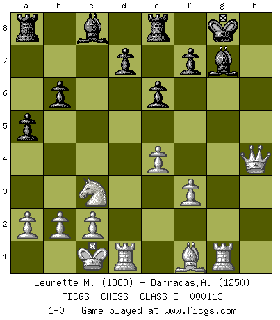 Last move : 1-0 2009 October 2 21:30:41 [Event "FICGS__CHESS__CLASS_E__000113"] [Site "FICGS"] [Date "2009.09.29"] [Round "1"] [White "Leurette,Marc-Antoine"] [Black "Barradas,Anderson"] [Result "1-0"] [WhiteElo "1389"] [BlackElo "1250"] 1.e4 c5 2.Nc3 e6 3.Nf3 Nc6 4.d4 cxd4 5.Nxd4 Nxd4 6.Qxd4 b6 7.Bf4 Bc5 8.Qd2 Nf6 9.O-O-O O-O 10.f3 Re8 11.g4 h6 12.h4 a5 13.g5 Nh5 14.gxh6 Nxf4 15.Qxf4 Bf8 16.hxg7 Bxg7 17.Rg1 Qxh4 18.Qxh4 1-0 Sicilian : Closed Queenside Castling by player White (move 9) Kingside Castling by player Black (move 9) Player White won this chess game. Follow this game move after move (download)Before the endgame, the Gods have placed the middle game. (Siegbert Tarrasch) Die Jungen erwarten, dass Opa einfach umfällt. Dann aber kann Opa fünf Stunden lang Schach spielen und die jungen Gegner an die Wand drücken. (Viktor Kortschnoi) Yo adoro todas la posiciones. Denme una partida posicional difícil, y la jugaré. Pero posiciones totalmente ganadas, no las tolero. (Hein Donner) Le jeu d'échecs est comme rejeté hors du temps. (Antoine de Saint-Exupéry) All men can see these tactics whereby I conquer, but what none can see is the strategy out of which victory is evolved. (Sun Tzu)