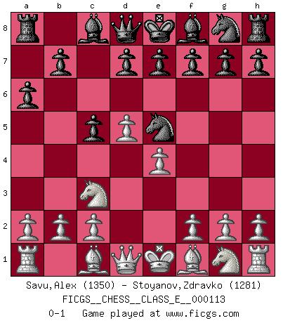 Last move : 0-1 2009 November 8 20:22:6 [Event "FICGS__CHESS__CLASS_E__000113"] [Site "FICGS"] [Date "2009.09.29"] [Round "1"] [White "Savu,Alex"] [Black "Stoyanov,Zdravko"] [Result "0-1"] [WhiteElo "1350"] [BlackElo "1281"] 1.e4 c5 2.d4 Nc6 3.d5 Ne5 4.Nc3 a6 0-1 This chess game has been lost on time (started : 2009.09.29 14:18:31) Sicilian : Smith-Morra gambit Player Black won this chess game. Follow this game move after move (download)Chess is a fairy tale of 1001 blunders. (Savielly Tartakower) Wie bekannt hörte Morphy 1859 auf, Schach zu spielen. Seine Enttäuschung galt nicht so sehr dem Schach, wie den Schachspielern. (Robert James Fischer) Debemos de asegurarnos de que el Ajedrez no se convierta en un lenguaje muerto, muy interesante, pero tan solo para un grupo muy pequeño. (Sytze Faber) Les erreurs sont comme les malheurs, elles n'arrivent jamais seules. (Siegbert Tarrasch) But they are useless. They can only give you answers. (Pablo Picasso, about computers)