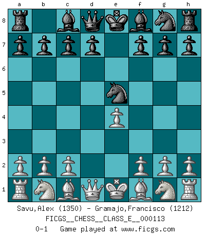 Last move : 0-1 2009 November 9 8:26:8 [Event "FICGS__CHESS__CLASS_E__000113"] [Site "FICGS"] [Date "2009.09.29"] [Round "1"] [White "Savu,Alex"] [Black "Gramajo,Francisco"] [Result "0-1"] [WhiteElo "1350"] [BlackElo "1212"] 1.e4 e5 2.d4 Nc6 3.dxe5 Nxe5 0-1 This chess game has been lost on time (started : 2009.09.29 14:18:31) King's pawn game Player Black won this chess game. Follow this game move after move (download)Help your pieces so they can help you. (Paul Morphy) Schach ist das Spiel, das die Verrückten gesund hält. (Albert Einstein) De eso se trata el Ajedrez. Un día le das una lección a tu oponente y al día siguiente el te da una a tí. (Bobby Fischer) Le plus grand jeu de l'esprit jamais inventé, plus vous l'apprenez, plus vous y prenez du plaisir. (Garry Kasparov) Life is painting a picture, not doing a sum. (Oliver Wendell Holmes, Jr.)