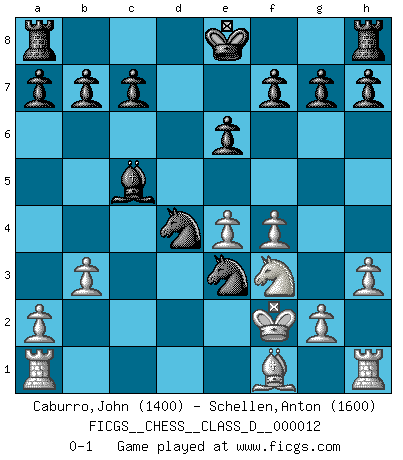 Last move : 0-1 2006 October 8 11:33:20 [Event "FICGS__CHESS__CLASS_D__000012"] [Site "FICGS"] [Date "2006.09.28"] [Round "1"] [White "Caburro,John"] [Black "Schellen,Anton"] [Result "0-1"] [WhiteElo "1400"] [BlackElo "1600"] 1.f4 d5 2.b3 Bg4 3.Bb2 e6 4.d3 Nc6 5.Nd2 Nh6 6.Ngf3 Nf5 7.e4 Ne3 8.Qc1 Nb4 9.Kf2 Nbxc2 10.h3 Bxf3 11.Nxf3 dxe4 12.dxe4 Qd6 13.Be5 Qc5 14.Bd4 Nxd4 15.Qxc5 Bxc5 0-1 Bird's Opening Player Black won this chess game. Follow this game move after move (download)The passed Pawn is a criminal, who should be kept under lock and key. Mild measures, such as police surveillance, are not sufficient. (Aaron Nimzovich) Wir können eben der zündenden Macht des Opfers nicht wiederstehen, denn die Begeisterung für das Opfer liegt in der Natur des Menschen. (Rudolf Spielmann) Cualquier cambio de material en una posición debe venir por medio de un mate, una captura o promoción de Peón. (Purdy) Toute estimation doit être constamment réévaluée. (Jacob Estrin) Animated gif is worth one mega-word. (Unknown)