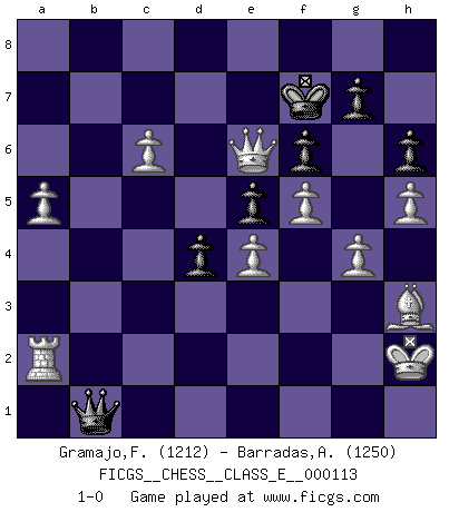 Last move : 1-0 2009 October 3 2:6:11 [Event "FICGS__CHESS__CLASS_E__000113"] [Site "FICGS"] [Date "2009.09.29"] [Round "1"] [White "Gramajo,Francisco"] [Black "Barradas,Anderson"] [Result "1-0"] [WhiteElo "1212"] [BlackElo "1250"] 1.Nf3 d5 2.g3 Nc6 3.Bg2 Nf6 4.O-O e5 5.d3 Bc5 6.Bg5 O-O 7.Bxf6 Qxf6 8.Nc3 Be6 9.Nb5 Qe7 10.h4 a6 11.Nc3 Rfd8 12.Ng5 h6 13.Nxe6 Qxe6 14.e4 d4 15.Nd5 Rd7 16.f4 Nb4 17.f5 Qd6 18.Nxb4 Bxb4 19.a3 Bc5 20.b4 Ba7 21.h5 c6 22.Bh3 f6 23.g4 Rf7 24.Rf3 c5 25.c4 b5 26.cxb5 axb5 27.Qb3 Kf8 28.a4 Bb6 29.bxc5 Bxc5 30.Qxb5 Rfa7 31.Rf2 Ba3 32.Rfa2 Bb4 33.Rb1 Rb8 34.Qd5 Qa6 35.Rxb4 Rc8 36.Rc4 Rxc4 37.dxc4 Qb6 38.Kh2 Re7 39.a5 Qb3 40.c5 Qb1 41.c6 Rc7 42.Qd8+ Kf7 43.Qxc7+ Ke8 44.Qc8+ Kf7 45.Qe6+ 1-0 Reti : King's Indian attack (Barcza system) Kingside Castling by player White (move 4) Kingside Castling by player Black (move 6) Player White won this chess game. Follow this game move after move (download)A sacrifice is best refuted by accepting it. (Wilhelm Steinitz) Der Umstand, daß uns eine 7 Stunden Zeitkontrolle ermöglicht eine großartige, tiefe Partie zu spielen, ist für die Massenmedien nicht weiter von Bedeutung. (Alexej Shirov) Al jugar al Ajedrez entonces, podemos aprender: Primero: Previsión... Segundo: Prudencia... Tercero: Cautela... Y al final, aprendemos del Ajedrez el hábito de no ser desanimados por apariencias malas presentes en el estado de nuestros asuntos, el hábito de la esperanza por una oportunidad favorable y la perseveración de los secretos de los recursos. (Benjamin Franklin) Le temps de noter son nom sur la feuille de partie, j'étais déjà en zeitnot ! D'un modeste amateur apparié lors de la première ronde d'un open contre le grand-maître Azmaïparashvili. There is a computer disease that anybody who works with computers knows about. It's a very serious disease and it interferes completely with the work. The trouble with computers is that you 'play' with them ! (Richard P. Feynman)