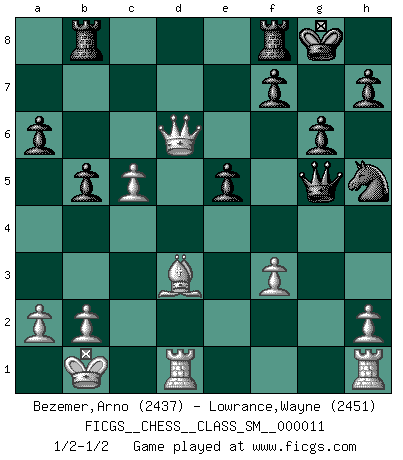 Last move : 1/2-1/2 2010 March 22 23:34:1 [Event "FICGS__CHESS__CLASS_SM__000011"] [Site "FICGS"] [Date "2009.09.29"] [Round "1"] [White "Bezemer,Arno"] [Black "Lowrance,Wayne"] [Result "1/2-1/2"] [WhiteElo "2437"] [BlackElo "2451"] 1.e4 c5 2.Nf3 d6 3.d4 cxd4 4.Nxd4 Nf6 5.Nc3 a6 6.Be3 e5 7.Nb3 Be7 8.f3 Be6 9.Qd2 Nbd7 10.g4 O-O 11.O-O-O Qc7 12.Kb1 b5 13.g5 Nh5 14.Nd5 Bxd5 15.exd5 Nb6 16.Na5 Nxd5 17.Qxd5 Qxa5 18.c4 Rab8 19.Bd3 Qd8 20.c5 Bxg5 21.Bxg5 Qxg5 22.Qxd6 g6 1/2-1/2 Sicilian : Najdorf, Byrne (English) attack Kingside Castling by player Black (move 10) Queenside Castling by player White (move 11) This chess game ended in a draw. Follow this game move after move (download)A great player and a great example for many. His book My 60 Memorable Games had a big impact on me. It is a shame he didn't continue to enrich the world of chess with his unparalleled understanding after 1972. (Jan Timman, about Bobby Fischer's death) Schach ist ein Teil der Kultur, und wenn es mit der Kultur abwärts geht, geht es auch mit dem Schach abwärts. (Mikhail Moiseyevich Botvinik) La vida es como el Ajedrez, con lucha, competición y eventos buenos y malos. (Benjamin Franklin) J'ai toujours senti une vague pitié pour l'homme qui ne connaît rien aux échecs, tout comme j'en aurais pour un homme ignorant de l'amour. Les Echecs, comme la musique ou comme l'amour, ont le pouvoir de rendre heureux. (Siegbert Tarrasch) The existence of forgetting has never been proved: We only know that some things don't come to mind when we want them. (Friedrich Nietzsche)
