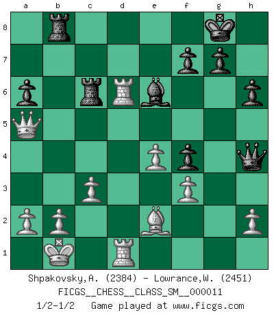 Last move : 1/2-1/2 2010 January 1 19:25:17 [Event "FICGS__CHESS__CLASS_SM__000011"] [Site "FICGS"] [Date "2009.09.29"] [Round "1"] [White "Shpakovsky,Alexander"] [Black "Lowrance,Wayne"] [Result "1/2-1/2"] [WhiteElo "2384"] [BlackElo "2451"] 1.e4 c5 2.Nf3 d6 3.d4 cxd4 4.Nxd4 Nf6 5.Nc3 a6 6.Be3 e5 7.Nb3 Be7 8.f3 Be6 9.Qd2 O-O 10.O-O-O Nbd7 11.g4 b5 12.g5 b4 13.gxf6 bxc3 14.Qxc3 Nxf6 15.Na5 Rc8 16.Nc6 Qc7 17.Nxe7+ Qxe7 18.Qa5 Rc6 19.Kb1 Rfc8 20.Rd2 Nh5 21.Be2 Nf4 22.Bxf4 exf4 23.Rhd1 h6 24.c3 Rb8 25.Rd4 Qh4 26.Rxd6 1/2-1/2 Sicilian : Najdorf, Byrne (English) attack Kingside Castling by player Black (move 9) Queenside Castling by player White (move 10) This chess game ended in a draw. Follow this game move after move (download)The stomach is an essential part of the Chess master. (Bent Larsen) Ich könnte leicht behaupten: Ja,ja, Leonid Breschnew wollte nicht, daß ich Weltmeister werde. In der Tat war die Sache komplizierter. (Viktor Kortschnoi) Aquel que teme a un Peón de Reina aislado, debería de retirarse del Ajedrez. (Siegbert Tarrasch) Des combinaisons [dans le jeu d'échecs] pareilles à des mélodies. Je crois entendre pour ainsi dire la musique des coups... (Vladimir Nabokov) Lottery : A tax on people who are bad at math. (Author unknown)