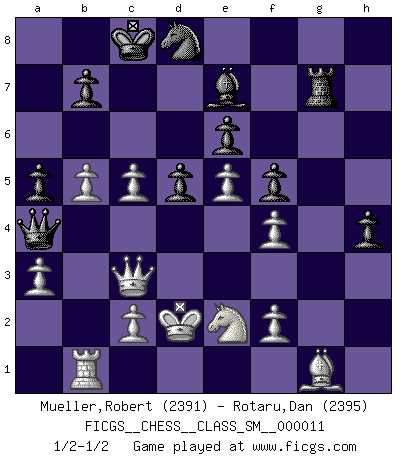 Last move : 1/2-1/2 2010 January 31 20:43:29 [Event "FICGS__CHESS__CLASS_SM__000011"] [Site "FICGS"] [Date "2009.09.29"] [Round "1"] [White "Mueller,Robert"] [Black "Rotaru,Dan"] [Result "1/2-1/2"] [WhiteElo "2391"] [BlackElo "2395"] 1.e4 c6 2.d4 d5 3.e5 c5 4.Nf3 Bg4 5.dxc5 Nc6 6.Bb5 Qa5+ 7.Nc3 e6 8.Be3 Nge7 9.a3 O-O-O 10.b4 Bxf3 11.gxf3 Qc7 12.Bxc6 Nxc6 13.Bf4 a6 14.Bg3 g5 15.h4 gxh4 16.Rxh4 h5 17.f4 Be7 18.Rh3 h4 19.Bh2 f5 20.Qd3 Rhg8 21.O-O-O Kb8 22.Ne2 Rg2 23.Rg1 Rdg8 24.Rxg2 Rxg2 25.Bg1 Qd8 26.Rh1 Qh8 27.Qh3 Qg7 28.Kd2 Na7 29.Bh2 Rg6 30.Ra1 Qh8 31.Nd4 Qc8 32.Qf3 Nc6 33.Ne2 Qd7 34.Qc3 a5 35.Rb1 Nd8 36.Qb3 Rg2 37.Bg1 Kc8 38.Qh3 Rg7 39.Qc3 Qa4 40.b5 Rg2 41.Qh3 Rg7 42.Qc3 1/2-1/2 Caro-Kann : Advance variation Queenside Castling by player Black (move 9) Queenside Castling by player White (move 21) This chess game ended in a draw. Follow this game move after move (download)Let the perfectionist play postal. (Yasser Seirawan) Wenn Capablanka heute auf der Schachbühne erscheinen würde, hätte er ein halbes Jahr gebraucht um sich die Schachtheorie anzueignen. Und dann hätte er alles und jeden besiegt. (Mikhail Moiseyevich Botvinik) El Ajedrez es sobre todo, ¡una pelea!. (Emanuel Lasker) Aucun coup ne doit être joué sans but. (Pedro Damiano) Whenever people agree with me, I always feel I must be wrong. (Oscar Wilde)