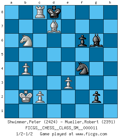 Last move : 1/2-1/2 2009 December 25 19:8:1 [Event "FICGS__CHESS__CLASS_SM__000011"] [Site "FICGS"] [Date "2009.09.29"] [Round "1"] [White "Shwimmer,Peter"] [Black "Mueller,Robert"] [Result "1/2-1/2"] [WhiteElo "2424"] [BlackElo "2391"] 1.e4 c5 2.Nf3 d6 3.d4 cxd4 4.Nxd4 Nf6 5.Nc3 a6 6.Bg5 e6 7.Qf3 Nbd7 8.O-O-O Be7 9.Rg1 Qc7 10.g4 h6 11.Qh3 b5 12.Bxf6 Bxf6 13.g5 Bxd4 14.Rxd4 Qc5 15.Qe3 hxg5 16.Rxg5 e5 17.Rd2 Qxe3 18.fxe3 g6 19.Rxd6 Rxh2 20.Bd3 Bb7 21.Nd5 O-O-O 22.b4 Nf8 23.Rxd8+ Kxd8 24.Rxe5 Rh1+ 25.Kb2 Rg1 26.Nb6 f6 27.Rc5 Ne6 28.Rc3 g5 29.a4 g4 30.axb5 axb5 31.Bxb5 Rd1 32.Be2 g3 33.Bxd1 g2 34.Bg4 Nf4 35.Bc8 Bxe4 36.Bd7 Bg6 37.Rc8+ 1/2-1/2 Sicilian : Najdorf, 6...e6 Queenside Castling by player White (move 8) Queenside Castling by player Black (move 21) This chess game ended in a draw. Follow this game move after move (download)Many Chess players were surprised when after the game, Fischer quietly explained: 'I had already analyzed this possibility' in a position which I thought was not possible to foresee from the opening. (Mikhail Tal) Kleine Schachspieler machen Mist, und große Schachspieler machen Mist, aber große machen weniger Mist. (Fritz Sämisch) Cuando veas una buena jugada, trata de encontrar otra mejor. (Emanuel Lasker) Vous n'êtes pas toujours obligé de jouer le meilleur coup. Un coup doit être actif, entreprenant, correct et beau ! (David Bronstein) O divine art of subtlety and secrecy! Through you we learn to be invisible, through you inaudible and hence we can hold the enemy's fate in our hands. (Sun Tzu)