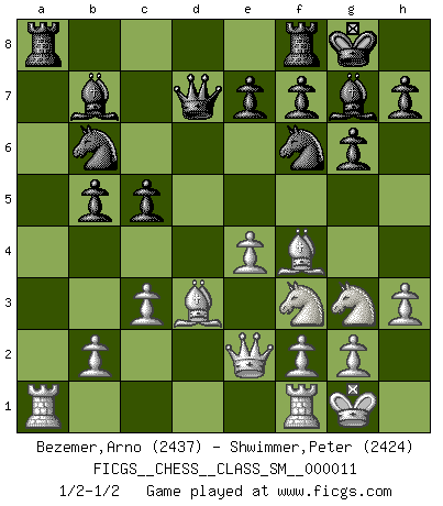 Last move : 1/2-1/2 2009 December 16 20:54:25 [Event "FICGS__CHESS__CLASS_SM__000011"] [Site "FICGS"] [Date "2009.09.29"] [Round "1"] [White "Bezemer,Arno"] [Black "Shwimmer,Peter"] [Result "1/2-1/2"] [WhiteElo "2437"] [BlackElo "2424"] 1.d4 d6 2.e4 Nf6 3.Nc3 g6 4.Be3 c6 5.Qd2 b5 6.Bd3 Bg7 7.Nf3 O-O 8.h3 Qc7 9.O-O Nbd7 10.Ne2 a6 11.a4 Bb7 12.Ng3 c5 13.c3 Nb6 14.axb5 axb5 15.dxc5 dxc5 16.Bf4 Qd7 17.Qe2 1/2-1/2 Queen's Pawn Kingside Castling by player Black (move 7) Kingside Castling by player White (move 9) This chess game ended in a draw. Follow this game move after move (download)Best by test: 1. e4 (Bobby Fischer) Strategie ist, wie man ein Mädchen auf den Rücksitz bekommt. Taktik ist, was man tut, wenn man dann dort ist. (Anonymous) Todos los Maestros de Ajedrez fueron un día unos principiantes. (Chernev) RxDa4 pat (...) Wikichess, chess moves explained by 'experimented' players. (Thibault de Vassal)