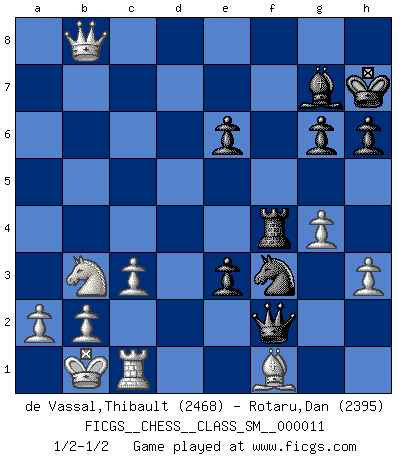 Last move : 1/2-1/2 2010 May 3 17:40:18 [Event "FICGS__CHESS__CLASS_SM__000011"] [Site "FICGS"] [Date "2009.09.29"] [Round "1"] [White "de Vassal,Thibault"] [Black "Rotaru,Dan"] [Result "1/2-1/2"] [WhiteElo "2468"] [BlackElo "2395"] 1.e4 c5 2.Nf3 d6 3.d4 cxd4 4.Nxd4 Nf6 5.Nc3 a6 6.Be3 e6 7.f3 b5 8.g4 h6 9.Qd2 b4 10.Nce2 e5 11.Nf5 d5 12.O-O-O Be6 13.Kb1 Nc6 14.Nc1 dxe4 15.Qe2 Qc7 16.h3 g6 17.Ng3 exf3 18.Qxf3 Bg7 19.Bc5 Rd8 20.Bxa6 Nd7 21.Qf2 Qa5 22.Ne4 Nxc5 23.Rxd8+ Nxd8 24.Nxc5 O-O 25.Re1 Nc6 26.Nxe6 fxe6 27.Qe2 Nd4 28.Qc4 Qb6 29.Nb3 Nf3 30.Rf1 Rf4 31.Qb5 Qd8 32.Rc1 Kh7 33.Qc5 Qh4 34.Bf1 Ng5 35.Qe7 Qf2 36.Qd6 Qf3 37.Qe7 Qh1 38.Nd2 Qh2 39.Nb3 e4 40.Qxb4 e3 41.Qb8 Nf3 42.c3 Qf2 1/2-1/2 Sicilian : Najdorf, Byrne (English) attack Queenside Castling by player White (move 12) Kingside Castling by player Black (move 24) This chess game ended in a draw. Follow this game move after move (download)You must take your opponent into a deep dark forest where 2+2=5, and the path leading out is only wide enough for one. (Mikhail Tal) Wer wird heute Abend ihr Gegner sein? -- Heute Abend spiele ich gegen die schwarzen Steine. (Akiba Rubinstein) a manera como él juega al Ajedrez, demuestra la completa naturaleza de un hombre. (Stanley Ellin) Assurément je connaissais par expérience le mystérieux attrait de ce jeu royal, le seul entre tous les jeux inventés par les hommes qui échappe souverainement à la tyrannie du hasard, le seul où l'on ne doive sa victoire qu'à son intelligence ou plutôt à une certaine forme d'intelligence. Mais n'est-ce pas déjà le limiter injurieusement que d'appeler les échecs un jeu ? N'est-ce pas une science, un art ou quelque chose qui, comme le cercueil de Mahomet entre ciel et terre, est suspendu entre l'un et l'autre, et qui réunit un nombre incroyable de contraires ? [...] C'est une pensée qui ne mène à rien, une mathématique qui n'établit rien, un art qui ne laisse pas d'uvre, une architecture sans matière; et il l'a prouvé néanmoins qu'il était plus durable, à sa manière, que les livres ou que tout autre monument, ce jeu unique qui appartient à tous les peuples et à tous les temps, et dont personne ne sait quel dieu en fit don à la terre pour tuer l'ennui, pour aiguiser l'esprit et stimuler l'âme. Où commence-t-il, où finit-il ? (Stefan Zweig) Internet: Absolute communication, absolute isolation. (Paul Carvel)