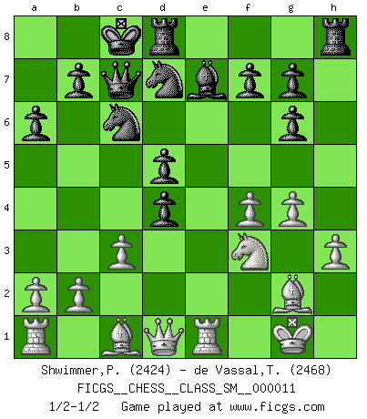 Last move : 1/2-1/2 2009 October 26 5:45:22 [Event "FICGS__CHESS__CLASS_SM__000011"] [Site "FICGS"] [Date "2009.09.29"] [Round "1"] [White "Shwimmer,Peter"] [Black "de Vassal,Thibault"] [Result "1/2-1/2"] [WhiteElo "2424"] [BlackElo "2468"] 1.e4 c5 2.Nf3 Nc6 3.Bb5 d6 4.O-O Bd7 5.Re1 Nf6 6.c3 a6 7.Bf1 Bg4 8.d3 e6 9.Nbd2 Be7 10.h3 Bh5 11.g4 Bg6 12.Nh4 Nd7 13.Nxg6 hxg6 14.f4 Qc7 15.Nf3 O-O-O 16.d4 d5 17.exd5 exd5 18.Bg2 cxd4 1/2-1/2 Sicilian : Nimzovich-Rossolimo attack (without ...d6) Kingside Castling by player White (move 4) Queenside Castling by player Black (move 15) This chess game ended in a draw. Follow this game move after move (download)The blunders are all there on the board, waiting to be made. (Savielly Tartakover) Der zweitbeste Zug ist oft der einzig richtige. (Savielly Grigorievitsch Tartakower) El Ajedrez moderno está demasiado preocupado con cosas como la estructura de Peones. Olvidenlo, el Jaque Mate termina la partida. (Nigel Short) Seul un grand joueur sait à quel point il joue faiblement. (Xavier Tartacover) The ego is not master in its own house. (Sigmund Freud)