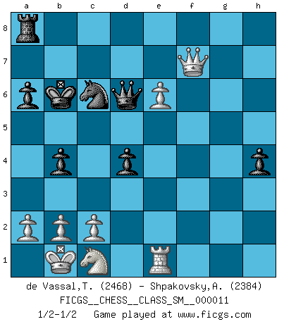 Last move : 1/2-1/2 2010 April 6 5:53:13 [Event "FICGS__CHESS__CLASS_SM__000011"] [Site "FICGS"] [Date "2009.09.29"] [Round "1"] [White "de Vassal,Thibault"] [Black "Shpakovsky,Alexander"] [Result "1/2-1/2"] [WhiteElo "2468"] [BlackElo "2384"] 1.e4 c5 2.Nf3 d6 3.d4 cxd4 4.Nxd4 Nf6 5.Nc3 a6 6.Be3 e6 7.f3 b5 8.g4 h6 9.Qd2 b4 10.Nce2 e5 11.Nf5 d5 12.O-O-O Be6 13.Kb1 Nc6 14.Nc1 d4 15.Bf2 g6 16.Ng3 Bg7 17.h4 h5 18.gxh5 Nxh5 19.Nxh5 Rxh5 20.Bg3 Bf6 21.Qf2 Bg5 22.f4 exf4 23.Bxf4 Bxf4 24.Qxf4 g5 25.Qf2 Rxh4 26.Rxh4 gxh4 27.Qf4 Kd7 28.e5 Kc7 29.Bg2 Bd5 30.Bxd5 Qxd5 31.e6 Qd6 32.Qxf7+ Kb6 33.Re1 1/2-1/2 Sicilian : Najdorf, Byrne (English) attack Queenside Castling by player White (move 12) This chess game ended in a draw. Follow this game move after move (download)Chess is above all, a fight ! (Emanuel Lasker) Man kann eine Schachpartie nur gewinnen, wenn das Gleichgewicht gestört ist. In einer Stellung mit ungestörtem Gleichgewicht ist auch das größte Genie hilflos - in der Stellung steckt dann eben kein genialer Einfall. (Wilhelm Steinitz) El Ajedrez hace al hombre ser mas sabio y ver mas claro. (Vladimir Putin) Les Echecs ont trois composantes : le temps, l'espace et le matériel en dernier. (Mikhail Tal) Wipe them out. All of them. (Darth Sidious in Star Wars ep.1)