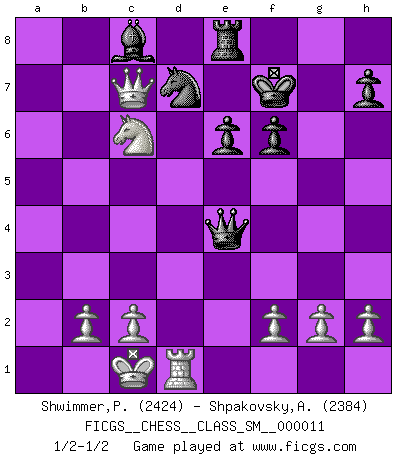 Last move : 1/2-1/2 2009 October 26 7:53:0 [Event "FICGS__CHESS__CLASS_SM__000011"] [Site "FICGS"] [Date "2009.09.29"] [Round "1"] [White "Shwimmer,Peter"] [Black "Shpakovsky,Alexander"] [Result "1/2-1/2"] [WhiteElo "2424"] [BlackElo "2384"] 1.e4 c5 2.Nf3 d6 3.d4 cxd4 4.Nxd4 Nf6 5.Nc3 a6 6.Bg5 e6 7.Qf3 Nbd7 8.O-O-O Qc7 9.Qg3 b5 10.Bxb5 axb5 11.Ndxb5 Qb7 12.Rxd6 Rxa2 13.Nc7+ Kd8 14.Nxe6+ fxe6 15.Nxa2 Bxd6 16.Qxd6 Qxe4 17.Bxf6+ gxf6 18.Nb4 Ke8 19.Nc6 Kf7 20.Rd1 Re8 21.Qc7 1/2-1/2 Sicilian : Najdorf, 6...e6 Queenside Castling by player White (move 8) This chess game ended in a draw. Follow this game move after move (download)If you aren't afraid of Spassky, then I have removed the element of money. (Jim Slater) Wie bekannt hörte Morphy 1859 auf, Schach zu spielen. Seine Enttäuschung galt nicht so sehr dem Schach, wie den Schachspielern. (Robert James Fischer) ¿Porque tengo que perder ante este idiota?. (Aron Nimzovich) 'L'échange des dames est un coup dur pour les deux adversaires...' Un journaliste lors d'une partie du match Spassky-Fischer Whoever said the pen is mightier than the sword obviously never encountered automatic weapons. (US General Douglas MacArthur)