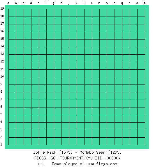 Last move : 0-1 2009 October 31 20:3:3 [Event "FICGS__GO__TOURNAMENT_KYU_III__000004"] [Site "FICGS"] [Date "2009.10.01"] [Round "1"] [Black "Ioffe,Nick"] [White "McNabb,Sean"] [Result "0-1"] [Rating 1 "1675"] [Rating 2 "1299"] 0-1 This go game has been lost on time (started : 2009.10.01 9:17:3) Here are the names of the openings (joseki) played in the four corners : Player White won this Go (weiqi, baduk) game. Follow this game move after move (download)The simplest move is the best move. (Anonymous) I couldn't make any sense out of what this particular thread is about. It sounds like R2 D2 computer speaking. A space fight ?!? Some 'command' problems in Moscow ? Some killers & narcotic addicts attacking some game & a god wannabe ?? (Dinesh De Silva, lost in a russian conflict in FICGS forum)