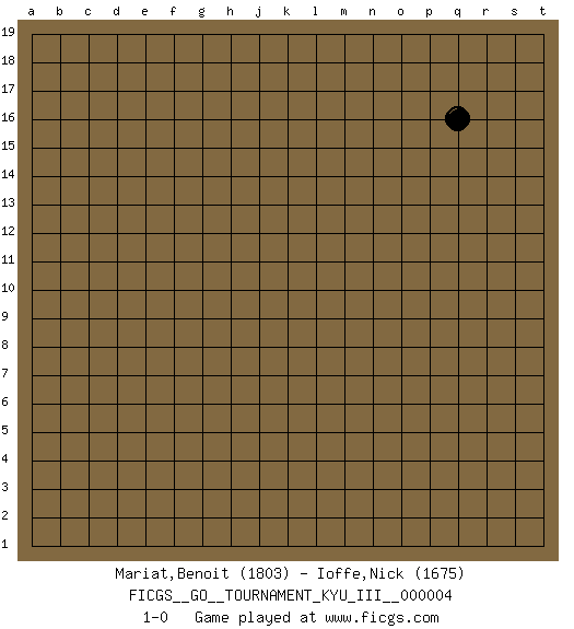 Last move : 1-0 2009 October 31 20:3:3 [Event "FICGS__GO__TOURNAMENT_KYU_III__000004"] [Site "FICGS"] [Date "2009.10.01"] [Round "1"] [Black "Mariat,Benoit"] [White "Ioffe,Nick"] [Result "1-0"] [Rating 1 "1803"] [Rating 2 "1675"] 1.q16 1-0 This go game has been lost on time (started : 2009.10.01 9:17:3) Here are the names of the openings (joseki) played in the four corners : Player Black won this Go (weiqi, baduk) game. Follow this game move after move (download)More haste less speed. (John Fairbairn) Difficult things take a long time, impossible things a little longer. (Author unknown)