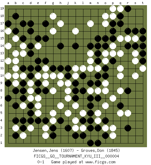 Last move : 0-1 2010 March 20 9:20:40 [Event "FICGS__GO__TOURNAMENT_KYU_III__000004"] [Site "FICGS"] [Date "2009.10.01"] [Round "1"] [Black "Jensen,Jens"] [White "Groves,Don"] [Result "0-1"] [Rating 1 "1607"] [Rating 2 "1845"] 1.q17 d15 2.d5 p3 3.j3 q15 4.p15 p14 5.p16 q13 6.o14 o13 7.n13 n14 8.o15 o12 9.n12 n11 10.m14 m11 11.o11 m13 12.n15 m12 13.n14 q11 14.o10 q10 15.n9 l9 16.p12 p13 17.q6 o6 18.n7 p7 19.m6 n5 20.k7 j8 21.k8 j9 22.k9 k10 23.l10 l11 24.j10 k11 25.h11 h10 26.j11 g10 27.g11 j7 28.j6 h6 29.f10 k6 30.m9 j5 31.h14 l5 32.l8 f9 33.g9 h9 34.e9 f11 35.f8 e10 36.f12 f9 37.f17 g8 38.e12 d3 39.f4 f3 40.g3 f2 41.d10 d9 42.e8 c10 43.e11 f10 44.d11 g4 45.c9 d8 46.c8 d7 47.c7 e7 48.b4 k16 49.k14 h17 50.d17 g16 51.e15 e14 52.f15 g18 53.r8 q8 54.h4 g5 55.g2 m17 56.d14 e5 57.r3 r5 58.m3 l3 59.l2 n2 60.n3 m2 61.l4 k3 62.k2 k4 63.o2 p2 64.m1 q5 65.r16 c14 66.d13 c16 67.c17 b17 68.b18 b3 69.c4 c6 70.b6 b9 71.b8 b7 72.a7 a8 73.a9 b10 74.c3 c13 75.d16 b15 76.c11 b12 77.a17 o3 78.n1 b11 79.a13 a10 80.d6 a12 81.a15 a14 82.b14 b13 83.c15 a14 84.b16 a16 85.e4 e6 86.d4 o8 87.m5 r15 88.s16 s15 89.t15 t14 90.t16 n8 91.m4 o9 92.n10 m8 93.m7 p18 94.s14 c2 95.b2 s13 96.t13 s12 97.q18 o17 98.t12 t11 99.t14 s10 100.o4 n4 101.p17 o18 102.r14 q19 103.r19 p19 0-1 Here are the names of the openings (joseki) played in the four corners : Corner q16 : q17 q15 Komoku (Somok, Xiao~mu`) 3-4 Point. The komoku (3-4) point is the traditional corner enclosure move.. Ikken Takagakari (Hankan Nop'dakeolch'im, Yi Gaogua`jiao~, 1-Space High Approach). The 5-4 approach move has become more popular in modern times, as modern Go emphasizes speed and influence. Corner q4 : p3 n9 Mokuhazushi (Waemok, Wai`mu`) 5-3 Point. The mokuhazushi (5-3) point was popular in the Edo period in Japan (1600 - 1867). It emphasizes influence; territorially, it is inferior to the 3-4 point. Corner d16 : d15 h11 Takamoku (Gomok, Gaomu`) 5-4 Point. The takamoku (high) point (5-4). With its emphasis on influence, the 5-4 point complements the 4-4 (hoshi) point in creating an influence-oriented fuseki. Player White won this Go (weiqi, baduk) game. Follow this game move after move (download)In the opening, when you don't know what to play, make a shimari. (Jansteen) He who is a good ruler must first have been ruled. (Aristotle)
