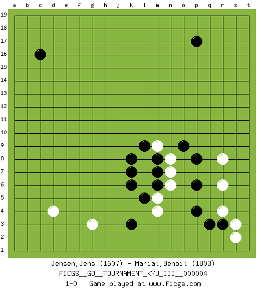 Last move : 1-0 2009 October 18 13:43:28 [Event "FICGS__GO__TOURNAMENT_KYU_III__000004"] [Site "FICGS"] [Date "2009.10.01"] [Round "1"] [Black "Jensen,Jens"] [White "Mariat,Benoit"] [Result "1-0"] [Rating 1 "1607"] [Rating 2 "1803"] 1.p17 d4 2.c16 r4 3.p4 m4 4.p6 r6 5.p8 r8 6.r3 s3 7.q3 s2 8.k3 g3 9.l5 m5 10.m6 l6 11.k6 l7 12.k8 l8 13.l9 m9 14.m8 n6 15.m7 n8 16.k7 n7 17.o9 1-0 Here are the names of the openings (joseki) played in the four corners : Corner q4 : r4 p4 Komoku (Somok, Xiao~mu`) 3-4 Point. The komoku (3-4) point is the traditional corner enclosure move.. Ikken Takagakari (Hankan Nop'dakeolch'im, Yi Gaogua`jiao~, 1-Space High Approach). The 5-4 approach move has become more popular in modern times, as modern Go emphasizes speed and influence. Player Black won this Go (weiqi, baduk) game. Follow this game move after move (download)If you cannot succeed, then die gloriously. (Chinese proverb) Philosophers use a language that is already deformed as though by shoes that are too tight. (Ludwig Wittgenstein)