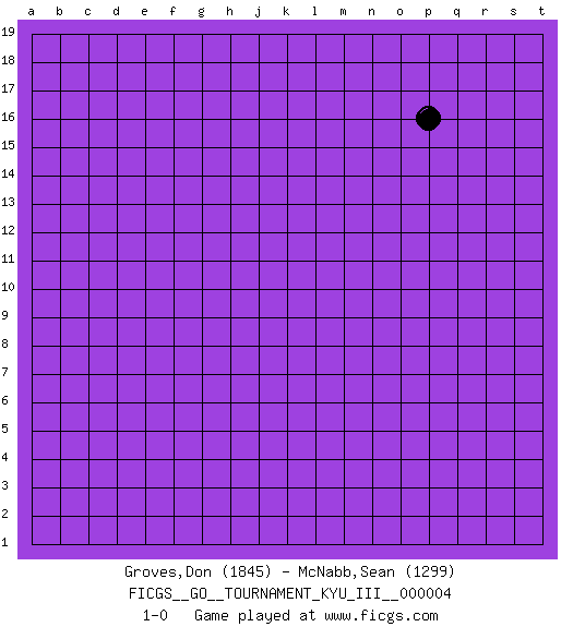 Last move : 1-0 2009 November 1 8:3:58 [Event "FICGS__GO__TOURNAMENT_KYU_III__000004"] [Site "FICGS"] [Date "2009.10.01"] [Round "1"] [Black "Groves,Don"] [White "McNabb,Sean"] [Result "1-0"] [Rating 1 "1845"] [Rating 2 "1299"] 1.p16 1-0 This go game has been lost on time (started : 2009.10.01 9:17:3) Here are the names of the openings (joseki) played in the four corners : Player Black won this Go (weiqi, baduk) game. Follow this game move after move (download)If you have won four corners, resign. (Anonymous) Memory is a crazy woman that hoards colored rags and throws away food. (Austin O'Malley)