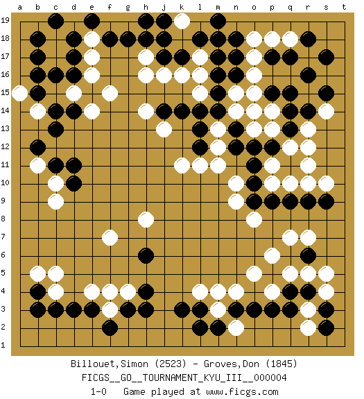Last move : 1-0 2009 December 24 0:24:33 [Event "FICGS__GO__TOURNAMENT_KYU_III__000004"] [Site "FICGS"] [Date "2009.10.01"] [Round "1"] [Black "Billouet,Simon"] [White "Groves,Don"] [Result "1-0"] [Rating 1 "2523"] [Rating 2 "1845"] 1.q15 p4 2.c16 c5 3.d3 e4 4.e3 f4 5.g3 c10 6.r4 q7 7.r6 r7 8.p5 q5 9.q4 o5 10.p3 p6 11.o3 f3 12.f2 g4 13.h3 r17 14.p17 r15 15.r14 p18 16.q17 q18 17.r16 o17 18.s17 e16 19.r18 h16 20.m17 o15 21.m15 n14 22.m14 m13 23.l13 m12 24.k14 k11 25.l12 l11 26.n13 o13 27.n12 m11 28.o12 p13 29.p12 q12 30.q11 p11 31.q13 r12 32.o11 p10 33.o10 n10 34.o9 n9 35.q9 c17 36.b17 c15 37.d17 c18 38.d16 d15 39.b15 e17 40.d18 e18 41.b18 r11 42.r9 n15 43.n16 o16 44.n18 d19 45.c19 o18 46.n17 l17 47.l18 l16 48.m16 l15 49.l14 k18 50.k17 l19 51.m18 k16 52.j17 j16 53.j18 k19 54.j19 j13 55.j14 h14 56.g18 h17 57.h18 g19 58.f18 f19 59.e19 q10 60.p9 d19 61.m19 k19 62.e19 r10 63.s9 r13 64.q14 s14 65.s15 r5 66.h19 n4 67.h4 s10 68.h6 f7 69.c13 b14 70.c14 a15 71.b16 s5 72.n3 m4 73.l3 l4 74.k3 h8 75.e15 m3 76.m2 f15 77.d14 e14 78.d11 d15 79.d10 c9 80.c11 n2 81.l2 s4 82.s3 r3 83.q3 r2 84.s2 o8 85.o14 p14 86.p15 o14 87.b4 c4 88.c3 b5 89.b3 b11 90.b12 1-0 Here are the names of the openings (joseki) played in the four corners : Corner d4 : c5 d3 Mokuhazushi (Waemok, Wai`mu`) 5-3 Point. The mokuhazushi (5-3) point was popular in the Edo period in Japan (1600 - 1867). It emphasizes influence; territorially, it is inferior to the 3-4 point. Komoku Kakari. Black 2 is the standard approach because of its solidity and stability. Corner q4 : p4 r4 Takamoku (Gomok, Gaomu`) 5-4 Point. The takamoku (high) point (5-4). With its emphasis on influence, the 5-4 point complements the 4-4 (hoshi) point in creating an influence-oriented fuseki. Komoku. White responds with 3-3, 3-5, 4-6, 4-7, 3-6, 3-7. Corner q16 : q15 r17 Takamoku (Gomok, Gaomu`) 5-4 Point. The takamoku (high) point (5-4). With its emphasis on influence, the 5-4 point complements the 4-4 (hoshi) point in creating an influence-oriented fuseki. San-san. White plays the 3-3 when Black has a stone at top such as marked. Corner d16 : c16 e16 Komoku (Somok, Xiao~mu`) 3-4 Point. The komoku (3-4) point is the traditional corner enclosure move.. Ikken Takagakari (Hankan Nop'dakeolch'im, Yi Gaogua`jiao~, 1-Space High Approach). The 5-4 approach move has become more popular in modern times, as modern Go emphasizes speed and influence. Player Black won this Go (weiqi, baduk) game. Follow this game move after move (download)If you lose by one point, take a rest. (Anonymous) Ah, the Socrating method. The best way we have of teaching everything-apart from juggling chainsaws. (Gregory House, House M.D.)
