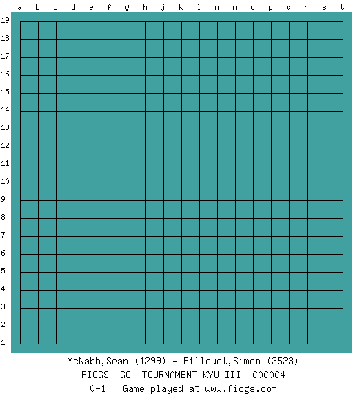 Last move : 0-1 2009 October 31 20:3:3 [Event "FICGS__GO__TOURNAMENT_KYU_III__000004"] [Site "FICGS"] [Date "2009.10.01"] [Round "1"] [Black "McNabb,Sean"] [White "Billouet,Simon"] [Result "0-1"] [Rating 1 "1299"] [Rating 2 "2523"] 0-1 This go game has been lost on time (started : 2009.10.01 9:17:3) Here are the names of the openings (joseki) played in the four corners : Player White won this Go (weiqi, baduk) game. Follow this game move after move (download)A knight's move near the edge of the board cannot be cut. (Bill Taylor) Over-the-board chess is the favorite of mortals, correspondence chess is the favorite of the gods. (Eduard Dyckhoff)