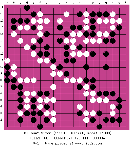 Last move : 0-1 2010 March 27 21:38:19 [Event "FICGS__GO__TOURNAMENT_KYU_III__000004"] [Site "FICGS"] [Date "2009.10.01"] [Round "1"] [Black "Billouet,Simon"] [White "Mariat,Benoit"] [Result "0-1"] [Rating 1 "2523"] [Rating 2 "1803"] 1.r15 d4 2.p3 d16 3.l16 r4 4.r6 q5 5.q6 o5 6.p6 p5 7.m3 p2 8.q2 o3 9.o2 n2 10.p1 n3 11.s2 m4 12.q10 r17 13.q18 q17 14.p18 p17 15.o17 q15 16.q14 p15 17.r14 p14 18.q12 n17 19.o16 n18 20.o18 n16 21.o15 n14 22.n15 m15 23.m16 o14 24.m18 l15 25.k15 l13 26.k13 k14 27.j14 l14 28.j16 g17 29.f3 h3 30.c6 f4 31.g4 g3 32.c4 c3 33.e4 f5 34.d3 d5 35.e5 e6 36.e3 d6 37.f6 g5 38.g6 h5 39.c5 e8 40.c7 d8 41.c2 c8 42.c17 c16 43.d17 e17 44.e18 f18 45.e16 f17 46.b16 b15 47.b17 c14 48.d19 f15 49.k12 l12 50.k11 f11 51.l11 n12 52.n10 h7 53.m13 m12 54.o12 r18 55.s16 s17 56.g13 f13 57.g12 g11 58.f12 e12 59.f14 e14 60.e13 d13 61.g15 f16 62.s5 o6 63.o7 n7 64.n8 m8 65.m7 n6 66.o8 l8 67.b8 b9 68.b7 f2 69.e2 k18 70.s4 r3 71.r2 j9 72.h11 h10 73.j10 h9 74.k9 k8 75.g2 h2 76.f1 j17 77.a9 b10 78.a10 a11 79.a8 r16 0-1 This go game has been lost on time (started : 2009.10.01 9:17:3) Here are the names of the openings (joseki) played in the four corners : Corner q4 : p3 r4 Mokuhazushi (Waemok, Wai`mu`) 5-3 Point. The mokuhazushi (5-3) point was popular in the Edo period in Japan (1600 - 1867). It emphasizes influence; territorially, it is inferior to the 3-4 point. Komoku Kakari. White 2 is the standard approach because of its solidity and stability. Corner d16 : d16 j14 Hoshi (Hwajeom, Seongjeom, Xingwei`) 4-4 Point. The star or hoshi (4-4) point, emphasizing influence at the potential expense of territory. Corner d4 : d4 f3 Hoshi (Hwajeom, Seongjeom, Xingwei`) 4-4 Point. The star or hoshi (4-4) point, emphasizing influence at the potential expense of territory. Ikken Kakari (Hankan Keolch'im, Yi Gua`jiao~, 1-Space Low Approach). Black 2 is the standard approach move to the 4-4. Player White won this Go (weiqi, baduk) game. Follow this game move after move (download)A few moments to learn, a lifetime to master. (Ancient proverb) Happy endings are just stories that haven't finished yet. (Jane Smith in Mr & Mrs Smith)