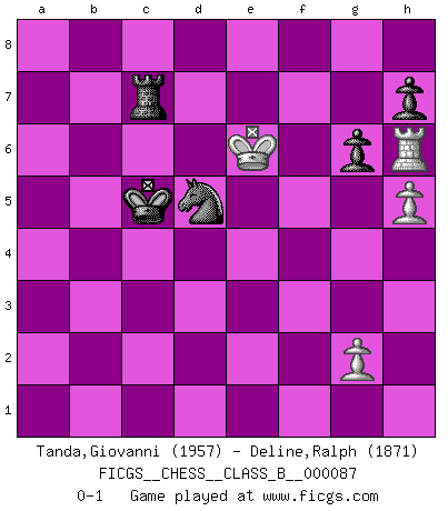Last move : 0-1 2010 February 27 22:8:28 [Event "FICGS__CHESS__CLASS_B__000087"] [Site "FICGS"] [Date "2009.10.01"] [Round "1"] [White "Tanda,Giovanni"] [Black "Deline,Ralph"] [Result "0-1"] [WhiteElo "1957"] [BlackElo "1871"] 1.d4 Nf6 2.Bf4 g6 3.Nf3 Bg7 4.e3 d6 5.Be2 O-O 6.O-O c5 7.Nbd2 Nc6 8.c3 cxd4 9.exd4 Be6 10.Re1 Qb6 11.Qc1 Rac8 12.Nc4 Bxc4 13.Bxc4 Nxd4 14.cxd4 d5 15.b3 dxc4 16.bxc4 Qa6 17.c5 b6 18.Bh6 e6 19.Bxg7 Kxg7 20.Qe3 Rfd8 21.Ne5 bxc5 22.dxc5 Nd5 23.Qh3 Rc7 24.Qh4 f6 25.Nf3 R8d7 26.Rac1 e5 27.Qc4 Qxc4 28.Rxc4 Nf4 29.Kf1 Rd5 30.c6 Rd6 31.Rec1 Nd5 32.Ke1 Ne7 33.Rb4 Rdxc6 34.Rxc6 Nxc6 35.Rc4 Kf7 36.Nd2 Rc8 37.f4 exf4 38.Rxf4 Ke6 39.Rc4 Kd5 40.Rc3 Kd4 41.Rh3 Rc7 42.Nb3+ Kc4 43.Nd2+ Kb5 44.Rb3+ Ka4 45.Rc3 Re7+ 46.Kf2 Nb4 47.Nb1 Kb5 48.Na3+ Kb6 49.Nc4+ Kc5 50.Ne3 Kd6 51.Nc4+ Ke6 52.Re3+ Kd7 53.Ra3 Kc6 54.Ne3 Rd7 55.Ng4 Kb5 56.Nxf6 Rf7 57.Rf3 Nxa2 58.Ke3 Nb4 59.Kd4 a5 60.Ke5 a4 61.Ke6 Rc7 62.Ne4 Rc2 63.Nc3+ Ka5 64.Nxa4 Kxa4 65.Rh3 Rc7 66.Rh6 Kb5 67.h4 Kc5 68.h5 Nd5 0-1 Queen's pawn game Kingside Castling by player Black (move 5) Kingside Castling by player White (move 6) 10 pieces endgame at move 64 : White KRNPP , Black KRNPP WHITE : King + 1 Rook 1 Knight 2 Pawns BLACK : King + 1 Rook 1 Knight 2 Pawns 9 pieces endgame at move 64 : White KRPP , Black KRNPP WHITE : King + 1 Rook 2 Pawns BLACK : King + 1 Rook 1 Knight 2 Pawns Player Black won this chess game. Follow this game move after move (download)No other master has such a terrific will to win. At the board he radiates danger, and even the strongest opponents tend to freeze, like rabbits when they smell a panther. Even his weaknesses are dangerous. As white, his opening game is predictable - you can make plans against it - but so strong that your plans almost never work. In the middle game his precision and invention are fabulous, and in the end game you simply cannot beat him. (Anonymous German Expert) Ein Buch ist ein Spiegel; wenn ein Affe hineinsieht, so kann kein Apostel heraus gucken. (Georg Christoph Lichtenberg) Un Peón pasado aumenta su poder a medida de que el número de piezas en el tablero disminuye. (Capablanca) Comme les marins qui ont mille raisons différentes d'aller en mer, les joueurs d'échecs en ont tout autant avant de s'installer devant une table et jouer... (Vincent Bertignac, philosophe) When you have everything, sometimes it feels like nothing. (Horatio Caine, C.S.I. Miami)