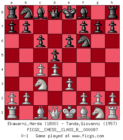 Last move : 0-1 2009 November 13 20:47:55 [Event "FICGS__CHESS__CLASS_B__000087"] [Site "FICGS"] [Date "2009.10.01"] [Round "1"] [White "Ekawarni,Herda"] [Black "Tanda,Giovanni"] [Result "0-1"] [WhiteElo "1800"] [BlackElo "1957"] 1.d4 d5 2.c4 c6 3.Nc3 e6 4.e3 Nf6 0-1 This chess game has been lost on time (started : 2009.10.01 11:39:6) QGD Slav defense Player Black won this chess game. Follow this game move after move (download)War is the child of passion, passion is the child of narcissism and narcissism is the child. (...) Another game ? (Thibault de Vassal) Es war undenkbar für die Behörden, dass ein sowjetischer Großmeister auf diese Art und Weise [Fischer-Taimanov 6:0] verliert, ohne dass es eine politischer Erklärung dafür gäbe. (Mark Taimanov) El Ajedrez hace al hombre ser mas sabio y ver mas claro. (Vladimir Putin) J'apprécie les joueurs d'est-indienne, c'est grâce à eux que je nourris ma famille depuis tant d'années. (Petrosian) I'll be back. (Arnold Schwarzenegger)