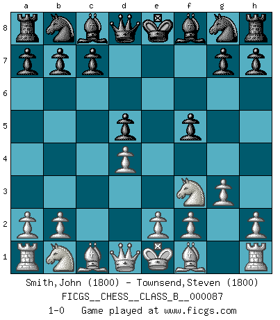 Last move : 1-0 2009 December 15 20:40:51 [Event "FICGS__CHESS__CLASS_B__000087"] [Site "FICGS"] [Date "2009.10.01"] [Round "1"] [White "Smith,John"] [Black "Townsend,Steven"] [Result "1-0"] [WhiteElo "1800"] [BlackElo "1800"] 1.d4 e6 2.c4 f5 3.g3 d5 4.cxd5 exd5 5.Nf3 1-0 This chess game has been lost on time (started : 2009.10.01 11:39:6) Queen's pawn Player White won this chess game. Follow this game move after move (download)At this time Fischer is simply a level above all the best Chessplayers in the world. (John Jacobs) Vom Schach wurde gesagt das Leben sei dafür nicht lange genug. Aber das ist der Fehler des Lebens, nicht des Schach'. (Irving Chernev) El Ajedrez era la lengua materna de Capablanca. (Reti) Que feriez-vous si vous étiez en train de jouer aux échecs et que la fin du monde arrive ? Je continuerais à jouer. (Saint Borromée) Now you put water in a cup, it becomes the cup; You put water into a bottle it becomes the bottle; You put it in a teapot it becomes the teapot. Water can flow or it can crash. Be water, my friend. (Bruce Lee)
