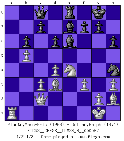 Last move : 1/2-1/2 2010 February 7 14:10:43 [Event "FICGS__CHESS__CLASS_B__000087"] [Site "FICGS"] [Date "2009.10.01"] [Round "1"] [White "Plante,Marc-Eric"] [Black "Deline,Ralph"] [Result "1/2-1/2"] [WhiteElo "1968"] [BlackElo "1871"] 1.e4 e5 2.Nf3 Nc6 3.Bb5 Nf6 4.O-O Nxe4 5.Re1 Nd6 6.Nxe5 Be7 7.Bf1 Nxe5 8.Rxe5 O-O 9.d4 Bf6 10.Re1 Nf5 11.c3 Re8 12.Rxe8+ Qxe8 13.Bf4 d6 14.Bd3 Qc6 15.Nd2 Be6 16.Ne4 Be7 17.Qh5 Re8 18.a4 a6 19.b4 h6 20.b5 Qd5 21.Qe2 axb5 22.axb5 b6 23.h3 Qb7 24.Ra6 Nh4 25.f3 Ng6 26.Bh2 Qc8 27.Qc2 Nh4 28.Ra1 1/2-1/2 Ruy Lopez : Berlin defense, Open variation Kingside Castling by player White (move 4) Kingside Castling by player Black (move 8) This chess game ended in a draw. Follow this game move after move (download)Play the opening like a book, the middle game like a magician, and the endgame like a machine. (Spielmann) Jede Eröffnung ist gut genug um gespielt zu werden, wenn nur ihr Ruf schlecht genug ist. (Savielly Grigorievitsch Tartakower) El Ajedrez es sobre todo, ¡una pelea!. (Emanuel Lasker) Un journaliste : 'Vous préférez avoir une dame de plus sur l'échiquier ou au lit ?' Boris Spassky : 'Ca dépend de la position.' The modern world has divided itself into Conservatives and Progressives. The business of Progressives is to go on making mistakes. The business of the Conservatives is to prevent the mistakes from being corrected. (G.K. Chesterton)