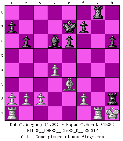 Last move : 0-1 2007 March 4 18:28:28 [Event "FICGS__CHESS__CLASS_D__000012"] [Site "FICGS"] [Date "2006.09.28"] [Round "1"] [White "Kohut,Gregory"] [Black "Ruppert,Horst"] [Result "0-1"] [WhiteElo "1700"] [BlackElo "1500"] 1.e4 c6 2.d4 d5 3.Nc3 dxe4 4.Nxe4 Nd7 5.Ng5 Ngf6 6.Bd3 e6 7.N1f3 Bd6 8.Qe2 h6 9.Ne4 Nxe4 10.Qxe4 Qc7 11.O-O b6 12.Qg4 g5 13.Qh5 Nf6 14.Qh3 g4 15.Qh4 gxf3 16.Qxf6 Bxh2+ 17.Kh1 fxg2+ 18.Kxg2 Rg8+ 19.Kh1 Bd6 20.Be3 Qe7 21.Qxe7+ Kxe7 22.Be4 Rg4 23.Bxc6 Bb7 24.Bxb7 Rag8 25.Bg2 Rxg2 26.Rg1 Rh2+ 0-1 This chess game has been lost on time (started : 2006.09.28 13:11:6) Caro-Kann : Steinitz variation Kingside Castling by player White (move 11) Player Black won this chess game. Follow this game move after move (download)All I want to do, ever, is just play Chess. (Bobby Fischer) Capablanka war das größte Genie der Schachgeschichte! Aber denken sie nicht er habe nichts vom Schach verstanden. Er wusste nur soviel wie er wissen musste um seine Ziele zu erreichen. (Mikhail Moiseyevich Botvinik) Del Ajedrez se ha dicho que la vida no es lo suficientemente larga para él, pero eso es culpa de la vida, no del Ajedrez. (William Ewart Napier) Aucun coup ne doit être joué sans but. (Pedro Damiano) All maxims have their antagonist maxims; proverbs should be sold in pairs, a single one being but a half truth. (William Mathews)