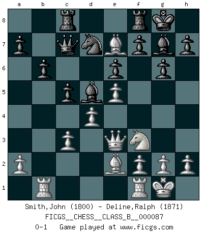 Last move : 0-1 2010 January 12 8:43:23 [Event "FICGS__CHESS__CLASS_B__000087"] [Site "FICGS"] [Date "2009.10.01"] [Round "1"] [White "Smith,John"] [Black "Deline,Ralph"] [Result "0-1"] [WhiteElo "1800"] [BlackElo "1871"] 1.d4 Nf6 2.c4 g6 3.Nc3 d5 4.cxd5 Nxd5 5.e4 Nxc3 6.bxc3 Bg7 7.Nf3 c5 8.Rb1 O-O 9.Be2 b6 10.O-O Bb7 11.Qd3 e6 12.Bg5 Qc7 13.Qe3 Nd7 14.e5 Bd5 15.Be7 Rac8 0-1 King's Indian defense, 3.Nc3 Kingside Castling by player Black (move 8) Kingside Castling by player White (move 10) Player Black won this chess game. Follow this game move after move (download)The game of Chess is not merely an idle amusement; several very valuable qualities of the mind are to be acquired and strengthened by it, so as to become habits ready on all occasions; for life is a kind of Chess. (Benjamin Franklin) Ich habe Kasparov in Rente geschickt. (Veselin Topalov) Todo se encuentra en un estado de flujo y esto incluye al mundo del Ajedrez. (Mikhail Botvinnik) Psychologiquement, tu dois avoir confiance en toi même, mais cette confiance doit être basée sur des faits. (Robert Fischer) Life doesn't imitate art, it imitates bad television. (Woody Allen)