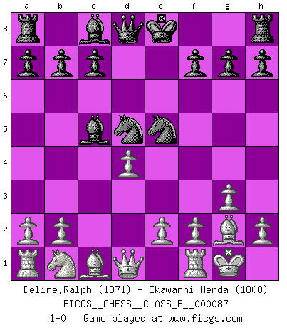 Last move : 1-0 2009 November 11 20:35:13 [Event "FICGS__CHESS__CLASS_B__000087"] [Site "FICGS"] [Date "2009.10.01"] [Round "1"] [White "Deline,Ralph"] [Black "Ekawarni,Herda"] [Result "1-0"] [WhiteElo "1871"] [BlackElo "1800"] 1.c4 e5 2.g3 Nf6 3.Bg2 d5 4.cxd5 Nxd5 5.Nf3 Nc6 6.O-O Bc5 7.Nxe5 Nxe5 8.d4 1-0 This chess game has been lost on time (started : 2009.10.01 11:39:6) English Opening Kingside Castling by player White (move 6) Player White won this chess game. Follow this game move after move (download)Tactics flow from a superior position. (Bobby Fischer) Schach ist gnadenlos. Du mußt bereit sein zu töten. (Nigel Short) La esencia del Ajedrez es pensar acerca de lo que el Ajedrez es. (David Bronstein) Dans le domaine de la peinture, de la gravure et de la sculpture, dès la première décennie de notre siècle, les artistes abandonnent la représentation de la partie d'échecs pour se concentrer sur les pièces, sur les échiquiers et sur toutes les variations auxquelles les unes et les autres peuvent donner lieu. On passe en quelque sorte d'un thème social à un thème musical (au sens de la musica médiévale, c'est-à-dire d'une notion qui inclue le rythme, l'harmonie, la construction et la déconstruction, etc.). Graphiquement et picturalement, l'échiquier apparaît comme une structure ouverte, dynamique, d'une richesse infinie, autorisant toutes les combinatoires et débouchant sur des mouvements et des rythmes de nature exponentielle. (Michel Pastoureau) All maxims have their antagonist maxims; proverbs should be sold in pairs, a single one being but a half truth. (William Mathews)