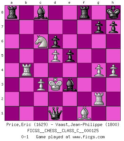Last move : 0-1 2009 November 22 23:48:35 [Event "FICGS__CHESS__CLASS_C__000125"] [Site "FICGS"] [Date "2009.10.01"] [Round "1"] [White "Price,Eric"] [Black "Vaast,Jean-Philippe"] [Result "0-1"] [WhiteElo "1629"] [BlackElo "1800"] 1.e4 c5 2.Nf3 Nc6 3.d4 cxd4 4.Nxd4 Nf6 5.Nc3 e5 6.Ndb5 d6 7.Bg5 a6 8.Na3 b5 9.Nd5 Be7 10.Bxf6 Bxf6 11.c3 O-O 12.Nc2 Bg5 13.a4 bxa4 14.Rxa4 Ne7 15.h4 Bh6 16.g4 Nxd5 17.exd5 Bf4 18.Nb4 a5 19.Nc6 Qb6 20.Ne7+ Kh8 21.b4 Qb7 22.Nc6 axb4 23.Rxb4 Qc7 24.f3 f5 25.Rg1 fxg4 26.fxg4 Be3 27.Rg2 Qf7 28.Ke2 Qf3+ 29.Kd3 Qxd1+ 0-1 Sicilian : Pelikan (Lasker/Sveshnikov) variation Kingside Castling by player Black (move 11) Player Black won this chess game. Follow this game move after move (download)You can only get good at Chess if you love the game. (Bobby Fischer) Schach ist ein Reich, wo sich die menschliche Phantasie frei entfalten kann. (David Bronstein) El Ajedrez, como la música, como el amor, tiene el poder de hacer feliz a la gente. (Siegbert Tarrasch) Aux échecs, l'amour-propre est satisfait quand on remporte la victoire, mais il n'y a pas de honte à être battu. (Benjamin Franklin) A married woman is like a fish riding a bicycle. (Rodolfo d'Ettorre)