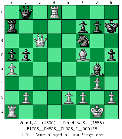 Last move : 1-0 2009 November 6 9:36:49 [Event "FICGS__CHESS__CLASS_C__000125"] [Site "FICGS"] [Date "2009.10.01"] [Round "1"] [White "Vaast,Jean-Philippe"] [Black "Denchev,Stanimir"] [Result "1-0"] [WhiteElo "1800"] [BlackElo "1656"] 1.c4 e5 2.g3 d5 3.cxd5 Qxd5 4.Nf3 Nf6 5.Nc3 Qa5 6.Bg2 c6 7.O-O Nbd7 8.d4 Bb4 9.Bd2 exd4 10.Nxd4 O-O 11.a3 Be7 12.Nd5 Qd8 13.Nxe7+ Qxe7 14.Qc2 Nb6 15.Bb4 Qc7 16.Bxf8 Kxf8 17.a4 a5 18.Rfd1 Bg4 19.Qc5+ Kg8 20.Nb5 Qc8 21.Qxb6 cxb5 22.Bxb7 Qb8 23.Qc6 Ra7 24.Bc8 h5 25.Rd8+ Kh7 26.Bf5+ 1-0 English Opening Kingside Castling by player White (move 7) Kingside Castling by player Black (move 10) Player White won this chess game. Follow this game move after move (download)He who takes the Queen's Knight's Pawn will sleep in the streets. (Anonymous) Du weisst es gibt ein Problem mit Computern und Fernschach, wenn jeder eine Rating von 2450 hat. (John Christen Knudsen) La enorme capacidad mental, en la que sin ella no puede un jugador de Ajedrez existir, es demasiado requerida por el Ajedrez al grado de que nunca podrá liberar su mente de este juego. (Albert Einstein) Si le désir cupide (et stupide) de gagner est une inépuisable source de souffrance, une combinaison brillante sur l'échiquier est une découverte : le coquelicot qui s'épanouit lorsque apparaît la Voie Lactée. (Arrabal) The human is the only animal species whose members are able to talk themselves into difficulties that would not otherwise exist. (Wendell Johnson)