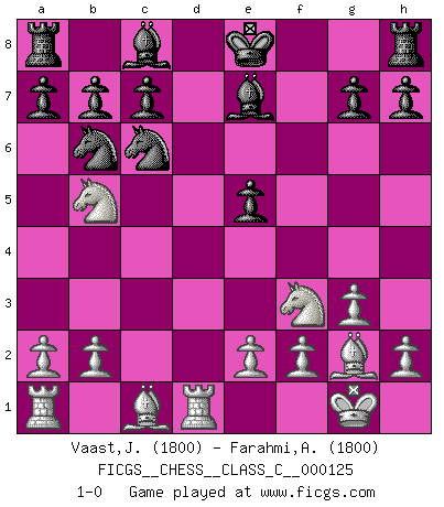 Last move : 1-0 2009 December 22 19:53:3 [Event "FICGS__CHESS__CLASS_C__000125"] [Site "FICGS"] [Date "2009.10.01"] [Round "1"] [White "Vaast,Jean-Philippe"] [Black "Farahmi,Andi"] [Result "1-0"] [WhiteElo "1800"] [BlackElo "1800"] 1.c4 e5 2.g3 Nf6 3.Bg2 d5 4.cxd5 Nxd5 5.Nf3 Nc6 6.O-O f6 7.d4 Nb6 8.dxe5 Qxd1 9.Rxd1 fxe5 10.Nc3 Be7 11.Nb5 1-0 This chess game has been lost on time (started : 2009.10.01 14:57:19) English Opening Kingside Castling by player White (move 6) Player White won this chess game. Follow this game move after move (download)Excellence at Chess is one mark of a scheming mind. (Sir Arthur Conan Doyle) Das Schachspiel hat wie die Liebe, die Musik, die Fähigkeit, den Menschen glücklich zu machen. Ich habe ein leises Gefühl des Bedauerns für jeden, der das Schachspiel nicht kennt, so wie ich jeden bedaure, der die Liebe nicht kennt. (Siegbert Tarrasch) Coloca el contenido del tablero de Ajedrez en un sombrero, agita las piezas vigorosamente, derrámalas en el tablero desde una altura de medio metro y así obtienes el estilo de Wilhelm Steinitz. (H. E. Bird) Tous ces prétendus hommes politiques sont les pions, les Cavaliers, les Tours ou les Fous d'une partie d'échecs qui se jouera tant qu'un hasard ne renversera pas l'échiquier. (Honoré de Balzac) No enterprise is more likely to succeed than one concealed from the enemy until it is ripe for execution. (Niccolo Machiavelli)