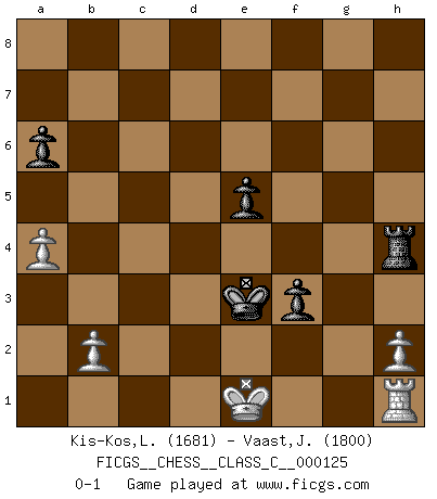 Last move : 0-1 2009 December 30 10:9:21 [Event "FICGS__CHESS__CLASS_C__000125"] [Site "FICGS"] [Date "2009.10.01"] [Round "1"] [White "Kis-Kos,Laszlo"] [Black "Vaast,Jean-Philippe"] [Result "0-1"] [WhiteElo "1681"] [BlackElo "1800"] 1.e4 c5 2.Nf3 Nc6 3.d4 cxd4 4.Nxd4 Nf6 5.Nc3 e5 6.Ndb5 d6 7.Bg5 a6 8.Na3 b5 9.Bxf6 gxf6 10.Nd5 f5 11.Bd3 Be6 12.Qh5 Rg8 13.g3 Nd4 14.c3 fxe4 15.Bxe4 Bg4 16.Qxh7 Rg7 17.Qh6 Nf3+ 18.Ke2 Ng5 19.f3 Nxe4 20.fxg4 Qc8 21.Qe3 Qxg4+ 22.Qf3 Qxf3+ 23.Kxf3 f5 24.Nc2 Kf7 25.Nce3 Nf6 26.Rad1 Nxd5 27.Nxd5 Ke6 28.Rhe1 Rh7 29.Re2 Bh6 30.Nb6 Rf8 31.Rf2 f4 32.Ke2 Bg7 33.gxf4 Rxf4 34.Rxf4 exf4 35.Rh1 Rh3 36.a4 b4 37.cxb4 Re3+ 38.Kd2 Rb3 39.Nc4 Rxb4 40.Kd3 Rb3+ 41.Kc2 Rh3 42.Nd2 Be5 43.Ne4 Kf5 44.Nf2 Rh4 45.Nd3 f3 46.Nxe5 dxe5 47.Kd2 Kf4 48.Ke1 Ke3 0-1 Sicilian : Pelikan (Lasker/Sveshnikov) variation 10 pieces endgame at move 46 : White KRPPP , Black KRPPP WHITE : King + 1 Rook 3 Pawns BLACK : King + 1 Rook 3 Pawns Player Black won this chess game. Follow this game move after move (download)If Chess is a science, it's a most inexact one. If Chess is an art, it is too exacting to be seen as one. If Chess is a sport, it's too esoteric. If Chess is a game, it's too demanding to be just a game. If Chess is a mistress, she's a demanding one. If Chess is a passion, it's a rewarding one. If Chess is life, it's a sad one. (Unknown) Wenn Capablanka heute auf der Schachbühne erscheinen würde, hätte er ein halbes Jahr gebraucht um sich die Schachtheorie anzueignen. Und dann hätte er alles und jeden besiegt. (Mikhail Moiseyevich Botvinik) No puedes jugar al Ajedrez si eres de corazón noble. (Proverbio Francés) Une platitude souvent récitée à propos des Echecs est qu'une des choses les plus difficiles à réaliser est de gagner une position gagnante. Cela ne manque pas de sens mais, pour ma part, j'ai toujours trouvé plus difficile de gagner une position perdante. (Tim Krabbe) Is not life a hundred times too short to bore ourselves ? (Friedrich Nietzsche)