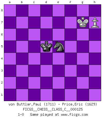 Last move : 1-0 2010 March 15 2:13:41 [Event "FICGS__CHESS__CLASS_C__000125"] [Site "FICGS"] [Date "2009.10.01"] [Round "1"] [White "von Buttlar,Paul"] [Black "Price,Eric"] [Result "1-0"] [WhiteElo "1711"] [BlackElo "1629"] 1.c4 e6 2.Nc3 Nf6 3.e4 c5 4.e5 Ng8 5.f4 d6 6.Nf3 Nc6 7.exd6 Bxd6 8.d4 cxd4 9.Nxd4 Nge7 10.Be3 Bb4 11.Qd2 Qa5 12.Nb3 Bxc3 13.bxc3 Qh5 14.Be2 Qg6 15.O-O O-O 16.Rad1 e5 17.Nc5 b6 18.Bd3 f5 19.Nb3 Rd8 20.Qf2 Be6 21.c5 e4 22.Bc2 Bc4 23.Rfe1 bxc5 24.Bxc5 Nd5 25.Bd4 Nxd4 26.Rxd4 Nb6 27.Red1 Qf6 28.Na5 Bxa2 29.Bxe4 fxe4 30.Qxa2+ Kh8 31.g3 Rxd4 32.cxd4 Qf5 33.Nc6 Qd5 34.Qxd5 Nxd5 35.Ra1 a5 36.Rxa5 Rxa5 37.Nxa5 h5 38.Kf2 g6 39.Nb3 Kg7 40.Nc5 e3+ 41.Ke2 Kf6 42.Nd7+ Kf5 43.Kf3 g5 44.fxg5 Kxg5 45.h4+ Kf5 46.Ne5 e2 47.Kxe2 Ke4 48.Nd7 Kxd4 49.Kf3 Kd3 50.g4 hxg4+ 51.Kxg4 Ke4 52.h5 Ne3+ 53.Kg5 Nf5 54.Kg6 Ne7+ 55.Kg5 Nf5 56.Nf6+ Ke5 57.Ng4+ Ke6 58.Kg6 Ne7+ 59.Kg7 Nf5+ 60.Kf8 Kd5 61.Ne3+ Nxe3 62.h6 Ng4 63.h7 Ne5 64.Kg7 1-0 English Opening Kingside Castling by player White (move 15) Kingside Castling by player Black (move 15) 10 pieces endgame at move 44 : White KNPPPP , Black KNPP WHITE : King + 1 Knight 4 Pawns BLACK : King + 1 Knight 2 Pawns 9 pieces endgame at move 44 : White KNPPP , Black KNPP WHITE : King + 1 Knight 3 Pawns BLACK : King + 1 Knight 2 Pawns 8 pieces endgame at move 47 : White KNPPP , Black KNP WHITE : King + 1 Knight 3 Pawns BLACK : King + 1 Knight 1 Pawn 7 pieces endgame at move 48 : White KNPP , Black KNP WHITE : King + 1 Knight 2 Pawns BLACK : King + 1 Knight 1 Pawn 6 pieces endgame at move 50 : White KNP , Black KNP WHITE : King + 1 Knight 1 Pawn BLACK : King + 1 Knight 1 Pawn 5 pieces endgame at move 51 : White KNP , Black KN WHITE : King + 1 Knight 1 Pawn BLACK : King + 1 Knight 4 pieces endgame at move 61 : White KP , Black KN WHITE : King + 1 Pawn BLACK : King + 1 Knight Player White won this chess game. Follow this game move after move (download)I feel as if I were a piece in a game of Chess, when my opponent says of it: That piece cannot be moved. (Soren Kierkegaard) Ich tröste mich mit dem Vergnügen, daß Schachfans, Zuschauer und Leser glücklich sind, wenn ein Großmeister etwas riskiert, statt nur Klötzchen zu schieben. (Mikhail Nekhemyevich Tal) Aquel que ve no otra dirección en el juego que la de dar Jaque Mate a su oponente, nunca será un buen jugador de Ajedrez. (Euwe) Les échecs sont un jeu par leur forme, un art par leur essence et une science par sa difficulté d'acquisition. Ils peuvent vous procurer autant de plaisir qu'un bon livre ou une belle musique, mais vous n'aurez une réelle joie que si vous arrivez à bien jouer. (Tigran Petrosian) I teach you to lie, cheat and steal, and as soon as my back's turned you wait in line ? (Gregory House, House M.D.)