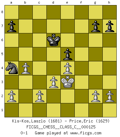 Last move : 0-1 2009 November 15 3:14:2 [Event "FICGS__CHESS__CLASS_C__000125"] [Site "FICGS"] [Date "2009.10.01"] [Round "1"] [White "Kis-Kos,Laszlo"] [Black "Price,Eric"] [Result "0-1"] [WhiteElo "1681"] [BlackElo "1629"] 1.e4 e5 2.Nf3 Nc6 3.Bc4 Nf6 4.Ng5 d5 5.exd5 Na5 6.Bb5+ c6 7.dxc6 bxc6 8.Qf3 Rb8 9.Bxc6+ Nxc6 10.Qxc6+ Nd7 11.Nc3 Bb7 12.Nxf7 Bxc6 13.Nxd8 Rxd8 14.O-O Bc5 15.d3 O-O 16.Be3 Bxe3 17.fxe3 Rxf1+ 18.Rxf1 Rf8 19.Rxf8+ Kxf8 20.b4 Nb6 21.Kf2 Ke7 22.e4 Ba4 23.Nxa4 Nxa4 24.Ke3 Kd6 0-1 Two knights defense Kingside Castling by player White (move 14) Kingside Castling by player Black (move 15) Player Black won this chess game. Follow this game move after move (download)Chess is above all, a fight ! (Emanuel Lasker) Ich erzeugte keinen Neid, da mich die Schachspieler als Musiker und die Musiker als Schachspieler betrachteten. (Mark Taimanov) Bendita sea la memoria de aquel que dio al mundo este juego inmortal. (A. G. Gardiner) Même un GMI sait rarement calculer sur plus de cinq coups une attaque à sacrifices. (Rudolf Spielmann) Heh, heh, heh. Time to abandon ship. (General Grievous in Star Wars ep.3)