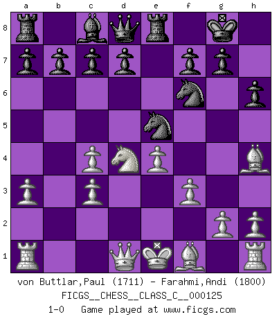 Last move : 1-0 2009 December 26 8:0:53 [Event "FICGS__CHESS__CLASS_C__000125"] [Site "FICGS"] [Date "2009.10.01"] [Round "1"] [White "von Buttlar,Paul"] [Black "Farahmi,Andi"] [Result "1-0"] [WhiteElo "1711"] [BlackElo "1800"] 1.c4 e5 2.Nc3 Nf6 3.Nf3 Nc6 4.d4 exd4 5.Nxd4 Bb4 6.Bg5 O-O 7.f3 h6 8.Bh4 Re8 9.a3 Bxc3+ 10.bxc3 Ne5 11.e4 1-0 This chess game has been lost on time (started : 2009.10.01 14:57:19) English Opening Kingside Castling by player Black (move 6) Player White won this chess game. Follow this game move after move (download)I have never in my life played the French Defence, which is the dullest of all openings. (Wilhelm Steinitz) Vom Schach wurde gesagt das Leben sei dafür nicht lange genug. Aber das ist der Fehler des Lebens, nicht des Schach'. (Irving Chernev) Nunca nadie ha ganado una partida de Ajedrez rindiendose. (Unknown) Nous sommes les pions de la mystérieuse partie d'Echecs jouée par Dieu. Il nous déplace, nous arrête, nous pousse encore, puis nous lance un à un dans la boîte du Néant. Epitaphe sur la tombe de David Janowsky (1868-1927). Hardware: the parts of a computer that can be kicked. (Jeff Persis)