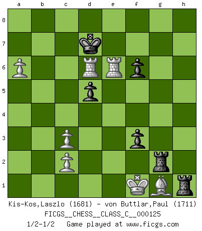 Last move : 1/2-1/2 2010 February 17 18:49:29 [Event "FICGS__CHESS__CLASS_C__000125"] [Site "FICGS"] [Date "2009.10.01"] [Round "1"] [White "Kis-Kos,Laszlo"] [Black "von Buttlar,Paul"] [Result "1/2-1/2"] [WhiteElo "1681"] [BlackElo "1711"] 1.e4 e6 2.d4 d5 3.Nc3 Bb4 4.e5 c5 5.a3 Bxc3+ 6.bxc3 Ne7 7.Qg4 cxd4 8.Qxg7 Rg8 9.Qxh7 Nbc6 10.Qd3 Nxe5 11.Qxd4 N7c6 12.Qd1 Bd7 13.Rb1 b6 14.Nf3 Qc7 15.Bf4 Nxf3+ 16.Qxf3 e5 17.Bg3 Be6 18.Qf6 a6 19.Bd3 Kd7 20.O-O b5 21.Rfe1 Qd8 22.Qxd8+ Raxd8 23.f3 f6 24.Bf2 Rb8 25.h4 Rg7 26.h5 Rbg8 27.Bg6 Ne7 28.g4 Nxg6 29.hxg6 Rxg6 30.a4 e4 31.axb5 exf3 32.bxa6 Rxg4+ 33.Kf1 Rh8 34.Rb7+ Kd6 35.Rb6+ Kd7 36.R1xe6 Rh1+ 37.Bg1 Rg2 38.Rbd6+ 1/2-1/2 French : Winawer, Advance, poisoned pawn variation Kingside Castling by player White (move 20) This chess game ended in a draw. Follow this game move after move (download)When asked, -How is that you pick better moves than your opponents?, I responded: I'm very glad you asked me that, because, as it happens, there is a very simple answer. I think up my own moves, and I make my opponent think up his. (Alexander Alekhine) Es ist schade, dass viele Schachsportler vergessen, wie wichtig Auftreten und angemessene Kleidung sind. (Alexandra Kosteniuk) Ser exitoso en el Ajedrez te permite descubrir tu propia personalidad. Eso es lo que deseo para los niños de mi clase. (Saudin Robovic) Il vaut mieux sacrifier les pièces de l'adversaire. (Xavier Tartacover) I would love to change the world, but they won't give me the source code. (Unknown)