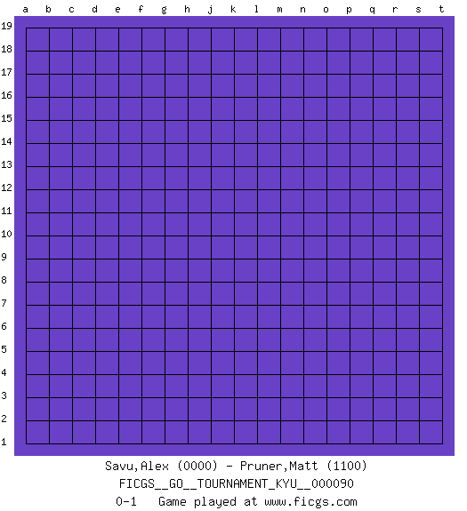 Last move : 0-1 2009 November 1 20:6:32 [Event "FICGS__GO__TOURNAMENT_KYU__000090"] [Site "FICGS"] [Date "2009.10.02"] [Round "1"] [Black "Savu,Alex"] [White "Pruner,Matt"] [Result "0-1"] [Rating 1 "0000"] [Rating 2 "1100"] 0-1 This go game has been lost on time (started : 2009.10.02 13:18:1) Here are the names of the openings (joseki) played in the four corners : Player White won this Go (weiqi, baduk) game. Follow this game move after move (download)Error is one of the sources of transformation. (Pierre Audouard) Ah, beer! The cause of, and the solution to, all of life's problems. (Homer Simpson)