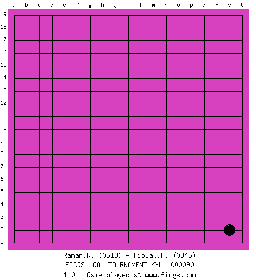 Last move : 1-0 2009 November 21 8:37:16 [Event "FICGS__GO__TOURNAMENT_KYU__000090"] [Site "FICGS"] [Date "2009.10.02"] [Round "1"] [Black "Raman,Ranganathan"] [White "Piolat,Philippe"] [Result "1-0"] [Rating 1 "0519"] [Rating 2 "0845"] 1.s2 1-0 This go game has been lost on time (started : 2009.10.02 13:18:1) Here are the names of the openings (joseki) played in the four corners : Corner q4 : s2 1-0 This joseki is unknown. A weak or weird move has probably been played in this corner. Player Black won this Go (weiqi, baduk) game. Follow this game move after move (download)If you don't know ladders, don't play go. (Anonymous) Computers have lots of memory but no imagination. (Anonymous)