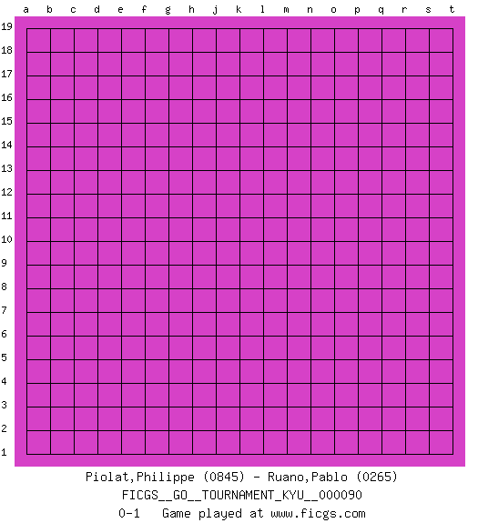 Last move : 0-1 2009 November 1 20:6:32 [Event "FICGS__GO__TOURNAMENT_KYU__000090"] [Site "FICGS"] [Date "2009.10.02"] [Round "1"] [Black "Piolat,Philippe"] [White "Ruano,Pablo"] [Result "0-1"] [Rating 1 "0845"] [Rating 2 "0265"] 0-1 This go game has been lost on time (started : 2009.10.02 13:18:1) Here are the names of the openings (joseki) played in the four corners : Player White won this Go (weiqi, baduk) game. Follow this game move after move (download)Don't overlook the edge of the board. (Anonymous) The problem with manipulation is that people can turn on you. (Horatio Caine, C.S.I. Miami)