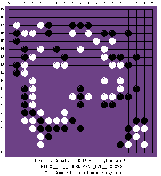 Last move : 1-0 2009 December 30 20:17:39 [Event "FICGS__GO__TOURNAMENT_KYU__000090"] [Site "FICGS"] [Date "2009.10.02"] [Round "1"] [Black "Learoyd,Ronald"] [White "Teoh,Farrah"] [Result "1-0"] [Rating 1 "0453"] 1.q16 d16 2.q3 d4 3.r9 d10 4.f3 e3 5.f4 e6 6.k4 h5 7.h4 f5 8.j5 h6 9.k7 j8 10.f17 e17 11.f16 e14 12.k17 k14 13.n16 n14 14.r13 p9 15.p8 o8 16.q8 p10 17.p13 p12 18.q12 o12 19.o13 n13 20.g14 g12 21.c14 r4 22.q4 r3 23.r5 q2 24.p2 s2 25.s5 s4 26.o7 n8 27.n7 n10 28.b16 c16 29.b15 b17 30.b11 c11 31.b12 c12 32.c13 d13 33.c9 d9 34.c8 d8 35.c7 d7 36.c6 c5 37.d6 d5 38.e4 e2 39.e5 g5 40.g4 j16 41.j17 l16 42.l17 o15 43.o16 m15 44.h13 h12 45.k8 l8 46.k9 1-0 This go game has been lost on time (started : 2009.10.02 13:18:1) Here are the names of the openings (joseki) played in the four corners : Corner d4 : d4 f3 Hoshi (Hwajeom, Seongjeom, Xingwei`) 4-4 Point. The star or hoshi (4-4) point, emphasizing influence at the potential expense of territory. Ikken Kakari (Hankan Keolch'im, Yi Gua`jiao~, 1-Space Low Approach). Black 2 is the standard approach move to the 4-4. Corner d16 : d16 f17 Hoshi (Hwajeom, Seongjeom, Xingwei`) 4-4 Point. The star or hoshi (4-4) point, emphasizing influence at the potential expense of territory. Ikken Kakari (Hankan Keolch'im, Yi Gua`jiao~, 1-Space Low Approach). Black 2 is the standard approach move to the 4-4. Player Black won this Go (weiqi, baduk) game. Follow this game move after move (download)Everything happens on a grid-engraved board with black and white pieces, but if that's all you see then you don't know Go. (Pierre Audouard) Looking at the proliferation of personal web pages on the Net, it looks like very soon everyone on Earth will have 15 megabytes of fame. (M.G. Sriram)