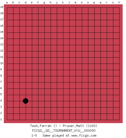 Last move : 1-0 2009 November 4 8:14:41 [Event "FICGS__GO__TOURNAMENT_KYU__000090"] [Site "FICGS"] [Date "2009.10.02"] [Round "1"] [Black "Teoh,Farrah"] [White "Pruner,Matt"] [Result "1-0"] [Rating 2 "1100"] 1.d4 1-0 This go game has been lost on time (started : 2009.10.02 13:18:1) Here are the names of the openings (joseki) played in the four corners : Corner d4 : d4 1-0 Hoshi (Hwajeom, Seongjeom, Xingwei`) 4-4 Point. The star or hoshi (4-4) point, emphasizing influence at the potential expense of territory. Player Black won this Go (weiqi, baduk) game. Follow this game move after move (download)On the second line six die, eight live. (Anonymous) It is not titles that honor men, but men that honor titles. (Niccolo Machiavelli)