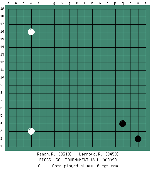 Last move : 0-1 2009 November 3 20:13:13 [Event "FICGS__GO__TOURNAMENT_KYU__000090"] [Site "FICGS"] [Date "2009.10.02"] [Round "1"] [Black "Raman,Ranganathan"] [White "Learoyd,Ronald"] [Result "0-1"] [Rating 1 "0519"] [Rating 2 "0453"] 1.s2 d16 2.q4 d3 0-1 This go game has been lost on time (started : 2009.10.02 13:18:1) Here are the names of the openings (joseki) played in the four corners : Corner d4 : d3 0-1 Komoku (Somok, Xiao~mu`) 3-4 Point. The komoku (3-4) point is the traditional corner enclosure move.. Player White won this Go (weiqi, baduk) game. Follow this game move after move (download)Territory is a closed space where time no longer exists. The transformation around it slower alter it, and sometimes it cracks open like a rotten egg at the least shock. (Pierre Audouard) The ultimate in disposing one's troops is to be without ascertainable shape. Then the most penetrating spies cannot pry in nor can the wise lay plans against you. (Sun Tzu)