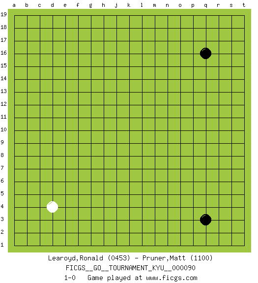 Last move : 1-0 2009 November 4 20:15:14 [Event "FICGS__GO__TOURNAMENT_KYU__000090"] [Site "FICGS"] [Date "2009.10.02"] [Round "1"] [Black "Learoyd,Ronald"] [White "Pruner,Matt"] [Result "1-0"] [Rating 1 "0453"] [Rating 2 "1100"] 1.q16 d4 2.q3 1-0 This go game has been lost on time (started : 2009.10.02 13:18:1) Here are the names of the openings (joseki) played in the four corners : Corner q4 : q3 1-0 Komoku (Somok, Xiao~mu`) 3-4 Point. The komoku (3-4) point is the traditional corner enclosure move.. Player Black won this Go (weiqi, baduk) game. Follow this game move after move (download)Balance is not what players strike for, and if it does arise, it is in spite of them. (Pierre Audouard) Internal peace cannot coexist with external war. (Don Groves)