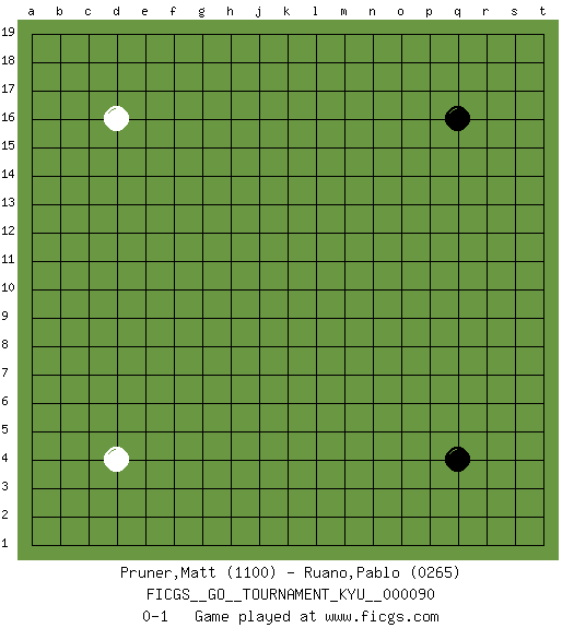 Last move : 0-1 2009 November 5 8:15:47 [Event "FICGS__GO__TOURNAMENT_KYU__000090"] [Site "FICGS"] [Date "2009.10.02"] [Round "1"] [Black "Pruner,Matt"] [White "Ruano,Pablo"] [Result "0-1"] [Rating 1 "1100"] [Rating 2 "0265"] 1.q16 d4 2.q4 d16 0-1 This go game has been lost on time (started : 2009.10.02 13:18:1) Here are the names of the openings (joseki) played in the four corners : Corner d4 : d4 0-1 Hoshi (Hwajeom, Seongjeom, Xingwei`) 4-4 Point. The star or hoshi (4-4) point, emphasizing influence at the potential expense of territory. Player White won this Go (weiqi, baduk) game. Follow this game move after move (download)On the third line, four die, six live. (Anonymous) You cannot beat a roulette table unless you steal money from it. (Albert Einstein)