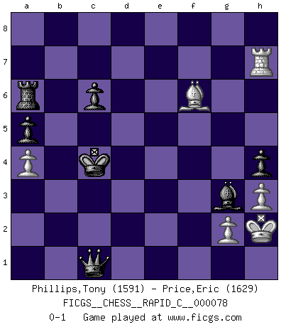 Last move : 0-1 2009 December 2 3:15:3 [Event "FICGS__CHESS__RAPID_C__000078"] [Site "FICGS"] [Date "2009.10.02"] [Round "1"] [White "Phillips,Tony"] [Black "Price,Eric"] [Result "0-1"] [WhiteElo "1591"] [BlackElo "1629"] 1.e4 e5 2.Bc4 Nf6 3.Nc3 Nxe4 4.Nf3 Nc6 5.Nxe4 d5 6.Bb5 dxe4 7.Nxe5 Qd5 8.Nxc6 Qxb5 9.Nd4 Qc4 10.c3 Bc5 11.Ne2 Bg4 12.h3 Bxe2 13.Qxe2 Qd3 14.Qxd3 exd3 15.O-O O-O 16.b4 Bb6 17.a4 a5 18.Ba3 Rfe8 19.Rae1 f6 20.b5 Kf7 21.c4 Bd4 22.Rd1 Re2 23.c5 c6 24.bxc6 bxc6 25.Kh1 Bxf2 26.Bb2 Ke6 27.Bc3 Kd5 28.Rb1 Kxc5 29.Rb7 Kc4 30.Rxg7 h5 31.Rc7 Ra6 32.Rh7 h4 33.Bxf6 Rxd2 34.Rc1+ Rc2 35.Rb1 d2 36.Rf1 Rc1 37.Rxc1+ dxc1Q+ 38.Kh2 Bg3+ 0-1 Bishop's Opening : Berlin defense Kingside Castling by player White (move 15) Kingside Castling by player Black (move 15) Promotion Queen by player Black (move 37) Player Black won this chess game. Follow this game move after move (download)A bad day of Chess is better than any good day at work. (Anonymous) Jeder Fehler erscheint unglaublich dumm, wenn andre ihn begehen. (Georg Christoph Lichtenberg) El Ajedrez es el arte del análisis. (Mikhail Botvinnik) L'attaque fait le spectacle, la défense gagne les matchs. (Dicton footballistique) Gambling is the son of avarice and the father of despair. (French proverb)