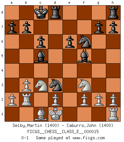 Last move : 0-1 2006 December 4 5:0:40 [Event "FICGS__CHESS__CLASS_E__000015"] [Site "FICGS"] [Date "2006.09.28"] [Round "1"] [White "Selby,Martin"] [Black "Caburro,John"] [Result "0-1"] [WhiteElo "1400"] [BlackElo "1400"] 1.e4 d5 2.Qf3 dxe4 3.Qxe4 Nf6 4.Qf3 e5 5.Bc4 Nc6 6.Nc3 Nd4 7.Qd3 Bf5 8.Qg3 Nxc2+ 9.Kd1 Qd4 10.Rb1 Qxc4 11.Qxe5+ Qe6 12.Qb5+ c6 13.Qe2 O-O-O 14.Qxe6+ fxe6 15.Nf3 Bc5 16.b3 Nb4 17.Rb2 Nd3 0-1 Scandinavian (centre counter) defense Queenside Castling by player Black (move 13) Player Black won this chess game. Follow this game move after move (download)The blunders are all there on the board, waiting to be made. (Savielly Tartakover) Ein Teil des Fehlers ist immer korrekt. (Savielly Grigorievitsch Tartakower) Dejen al perfeccionista jugar por correo. (Yasser Seirawan) Les Echecs représentent une sphère d'idées créatrices basée sur la volonté des deux protagonistes. (Smyslov) Before all elsed, be armed. (Niccolo Machiavelli)