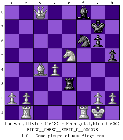 Last move : 1-0 2009 November 18 3:22:0 [Event "FICGS__CHESS__RAPID_C__000078"] [Site "FICGS"] [Date "2009.10.02"] [Round "1"] [White "Laneval,Olivier"] [Black "Pernigotti,Nico"] [Result "1-0"] [WhiteElo "1613"] [BlackElo "1600"] 1.c4 Nf6 2.Nc3 g6 3.e4 Bg7 4.d4 O-O 5.Nf3 d6 6.Be3 e6 7.Bd3 Nbd7 8.O-O a6 9.Qc2 b5 10.cxb5 axb5 11.Nxb5 Rb8 12.Nxc7 Qxc7 13.Qxc7 Ng4 14.Rab1 d5 15.exd5 Nxe3 16.fxe3 exd5 17.Qd6 Re8 18.Qxd5 Rxe3 19.Bc4 Nf6 20.Qxf7+ Kh8 21.Qc7 Bf8 22.Qxb8 h5 23.Qxc8 Kg7 24.Ne5 1-0 English Opening Kingside Castling by player Black (move 4) Kingside Castling by player White (move 8) Player White won this chess game. Follow this game move after move (download)I have never in my life played the French Defence, which is the dullest of all openings. (Wilhelm Steinitz) Im Schach gibt es keinen Platz für Galanterie. (Irving Chernev) Nunca nadie ha ganado una partida de Ajedrez rindiendose. (Unknown) La menace est plus forte que l'exécution. (Aaron Nimzovitch) Unless in communicating with it one says exactly what one means, trouble is bound to result. (Alan Turing, about computers)