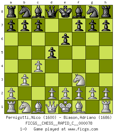 Last move : 1-0 2009 November 7 20:20:0 [Event "FICGS__CHESS__RAPID_C__000078"] [Site "FICGS"] [Date "2009.10.02"] [Round "1"] [White "Pernigotti,Nico"] [Black "Biason,Adriano"] [Result "1-0"] [WhiteElo "1600"] [BlackElo "1686"] 1.Nf3 d5 2.c4 e6 3.b3 1-0 This chess game has been lost on time (started : 2009.10.02 15:2:47) Reti Opening Player White won this chess game. Follow this game move after move (download)The most powerful weapon in Chess is to have the next move. (David Bronstein) Ich bin es gewohnt, das die Jugend mir überhaupt keinen Respekt entgegenbringt. (Alexander Morozewich) Una compensación adecuada por un sacrificio es tener una combinación sólida que conduce a una posición ganadora; una compensación adecuada por una metida de pata es dejar a tu oponente arrebatar una derrota de las fauces de la victoria. (Bruce A. Moon) Aux échecs, l'amour-propre est satisfait quand on remporte la victoire, mais il n'y a pas de honte à être battu. (Benjamin Franklin) 'preceded by its own quotation yields a falsehood' preceded by its own quotation yields a falsehood. (W. V. O. Quine - Set Theory And Its Logic, 1953)
